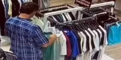 Nakon što se uveri da nema nikoga u blizini, muškarac skida majicu s vešalice, pažljivo je skriva u bermudama ispod košulje i potom, iznenađujuće, uzima i vešalicu, koju je vezao za leđa i takođe smestio u bermude.