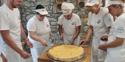 - Nakon što se ispeče lepinja na nju se stavlja kajmak, zatim jaja i onda se noževima meša ta smesa po njoj. Bitno je da se sve dobro umuti, a zatim ide u peć na bukova drva da se peče. Kada se ispeče zaliva se pretopom – objašnjava Draganova ćerka Nevena.