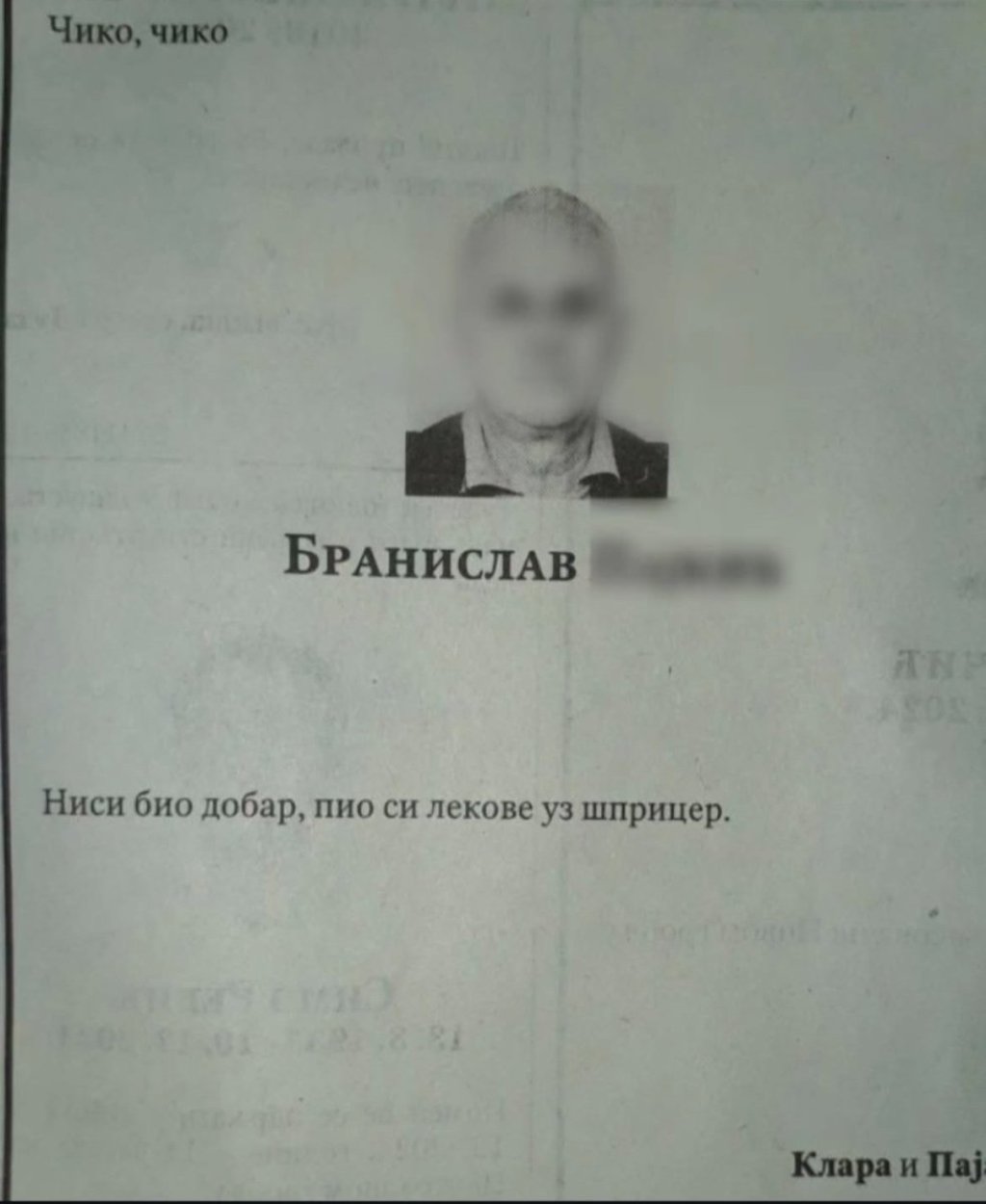 - Čiko, Čiko! Nisi bio dobar, pio si lekove uz špricer - piše u čitulji, dok u potpisu stoje Klara i Paja.