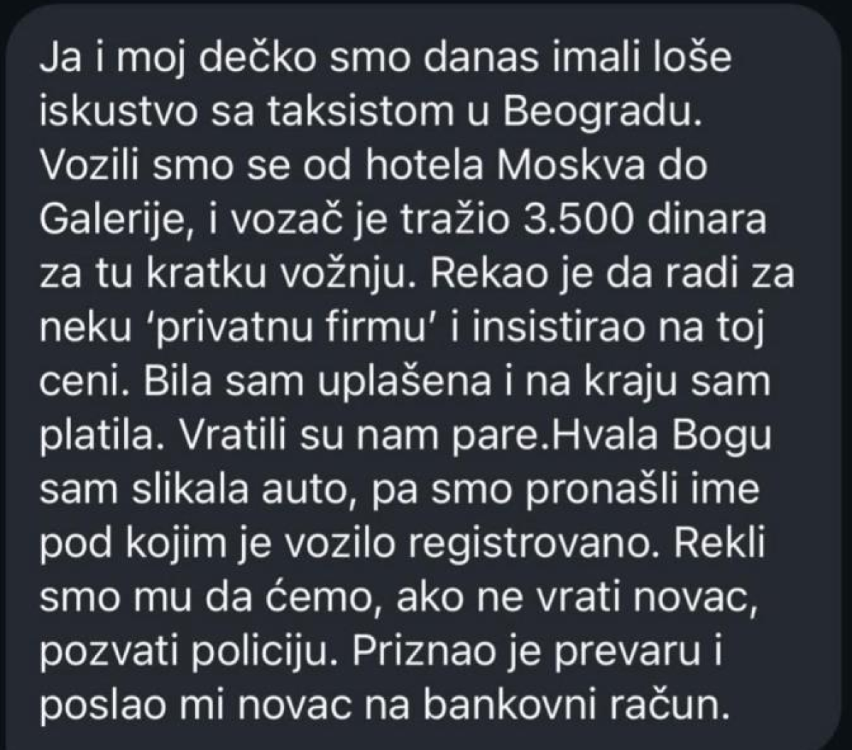 - Ja i moj dečko smo danas imali loše iskustvo sa taksistom u Beogradu. Vozili smo se od hotela "Moskva" do tržnog centra "Galerija" i vozač je tražio 3.500 dinara za tu kratku vožnju. Rekao je da radi za neku "privatnu firmu" i insistirao na toj ceni. Bila sam uplašena i na kraju sam platila - napisala je devojka.