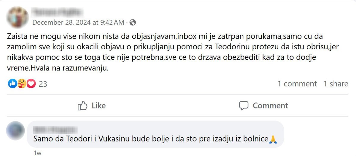 - Zaista ne mogu više nikom ništa da objašnjavam, inboks mi je zatrpan porukama. Samo ću da zamolim sve koji su okačili objavu o prikupljanju pomoći Teodori da istu obrišu, jer nikakva pomoć što se toga tiče nije potrebna. Sve će to država obezbediti kad za to dođe vreme. Hvala na razumevanju - napisala je.