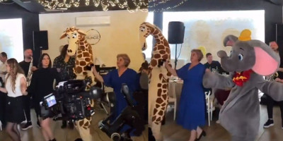 Naravno, u pitanju su maskote žirafe, slona i lava, ali priznaćete da je prizor podjednako neobičan, šokantan i diskutabilan s obzirom na to da animatori obično i kratkoročno zanimaju decu na proslavi, a ne igraju kolo sa gostima. Doduše, čini se da se svi lepo zabavljaju u datom trenutku, pa čitav prizor dobija neku neobičnu čar.