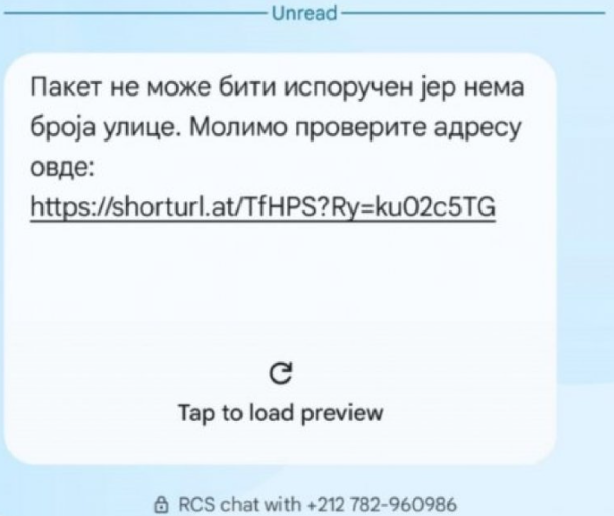- Paket ne može biti isporučen jer nema broja ulice. Molimo proverite adresu na linku - ovo je poruka koja stiže građanima putem SMS sa broja +212782-960986 i u pitanju je prevara.