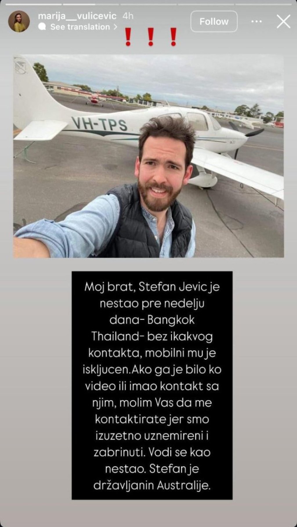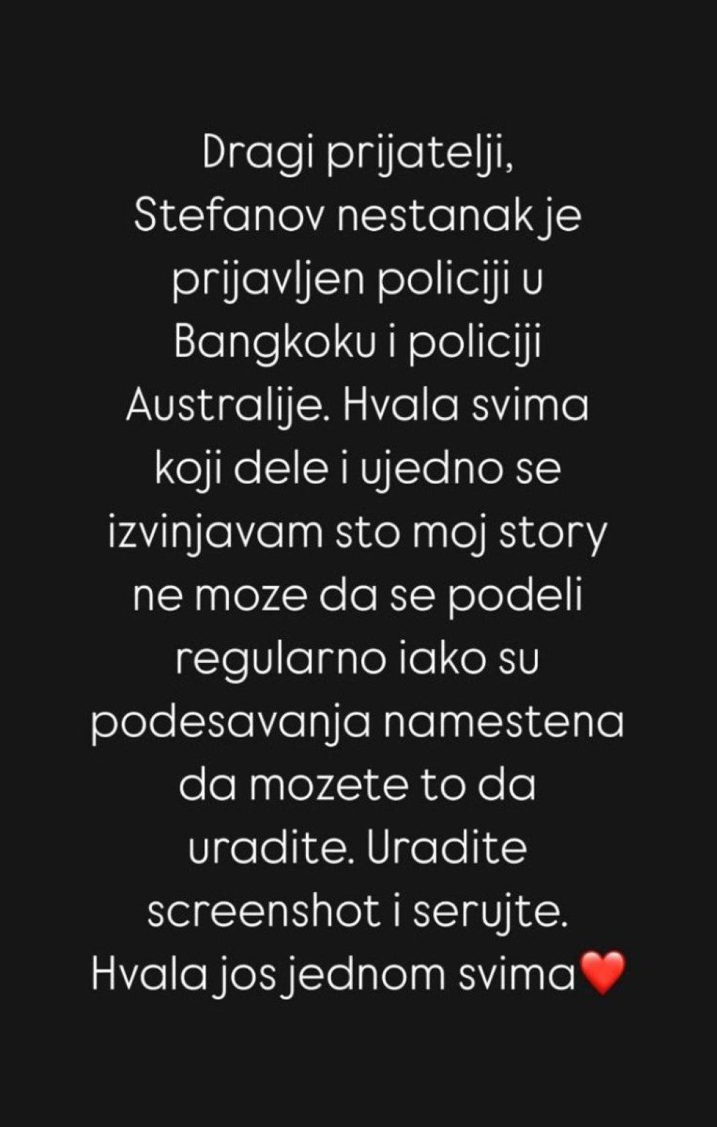 Kako ona navodi na društvenim mrežama, Stefan je nestao pre nedelju dana u Bangkoku. Od tada mu je mobilni telefon nedostupan.