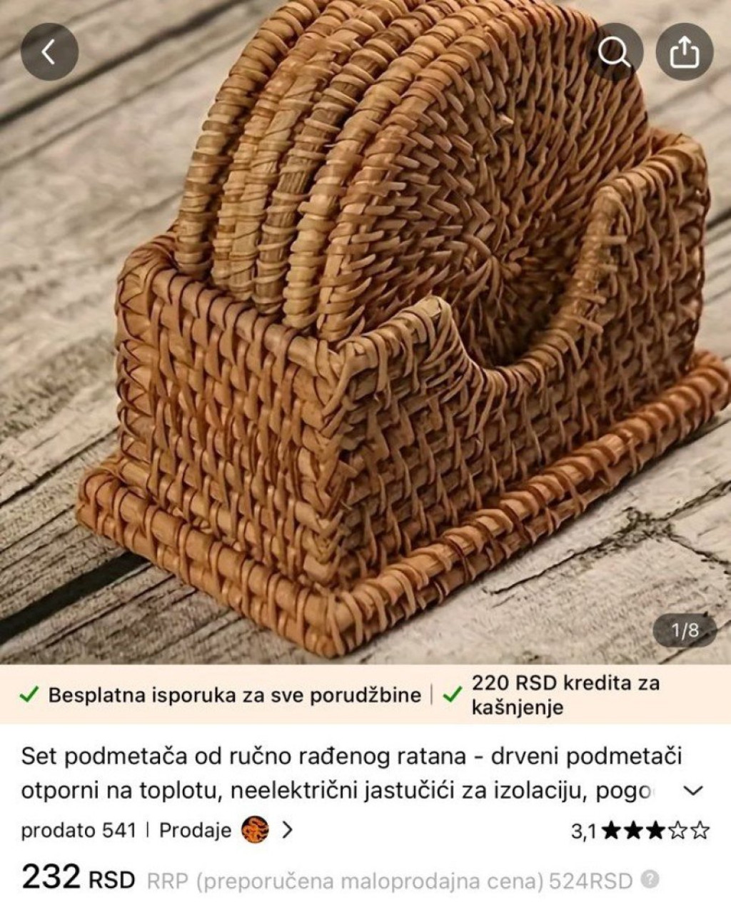 U opisu proizvoda jasno piše da kupac za 220 dinara dobija set ručno pravljenih podmetača od ratana, otpornih na toplotu, uz dodate pohvale prodavca, ali, komentari kupaca govore drugačije!