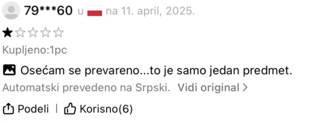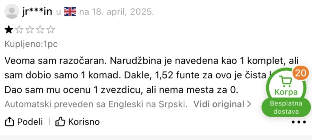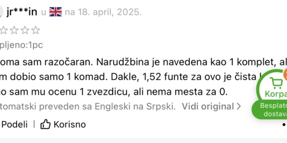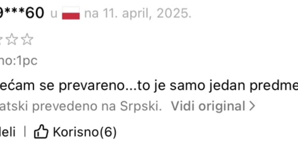 Umesto čitavog seta, ovde dobijete samo jedan podmetač po toj ceni, tako da je većina prevarenih ljudi ovom proizvodu dala jako nisku ocenu.