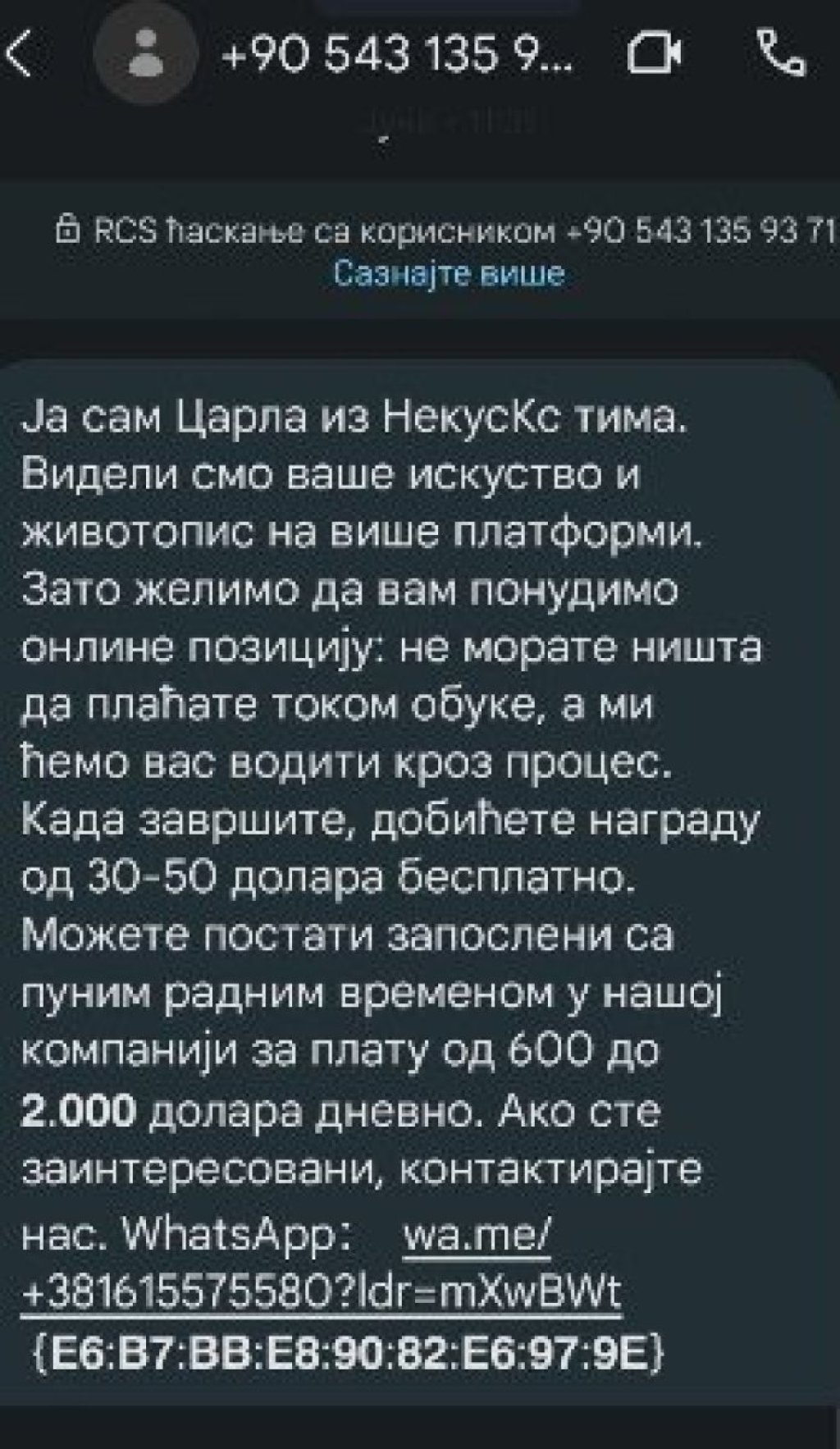 Najveća pretnja po korisnike jeste link koji stoji u poruci i od kojeg vas deli velika prevara. Ukoliko nasednete na ovu prevaru i uđete na link kako biste videli o kakvom poslu je reč, istog trenutka postajete žrtva prevaranata.