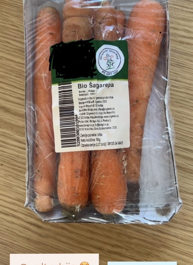 Pakovanje šargarepa bilo je otvoreno i falila je jedna šargarepa!S obzirom da se na pakovanju jasno vidi da je oštećenje namerno počinjeno, utvrđeno je da nije problem u prodavnicama već u dostavljačima koji udaraju na potrošače.