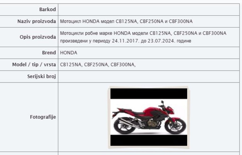 Prema navodima sajta Nepro sporni motor je u modelima CB125NA, CBF250NA i CBF300NA proizvedeni u periodu 24.11.2017. do 23.07.2024. godine.
