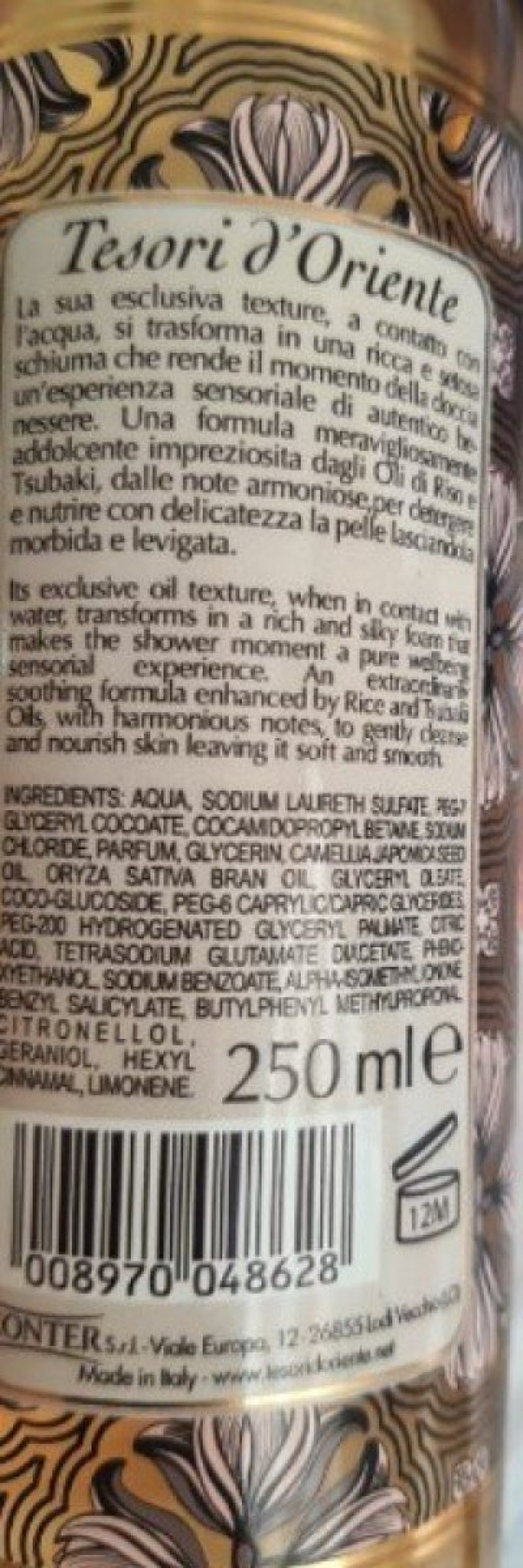Reč je o ulju za tuširanje "Tesori d'Oriente" iz linije "Oli di riso e tsubaki", sa naznačenim barkodom 8008970048628.