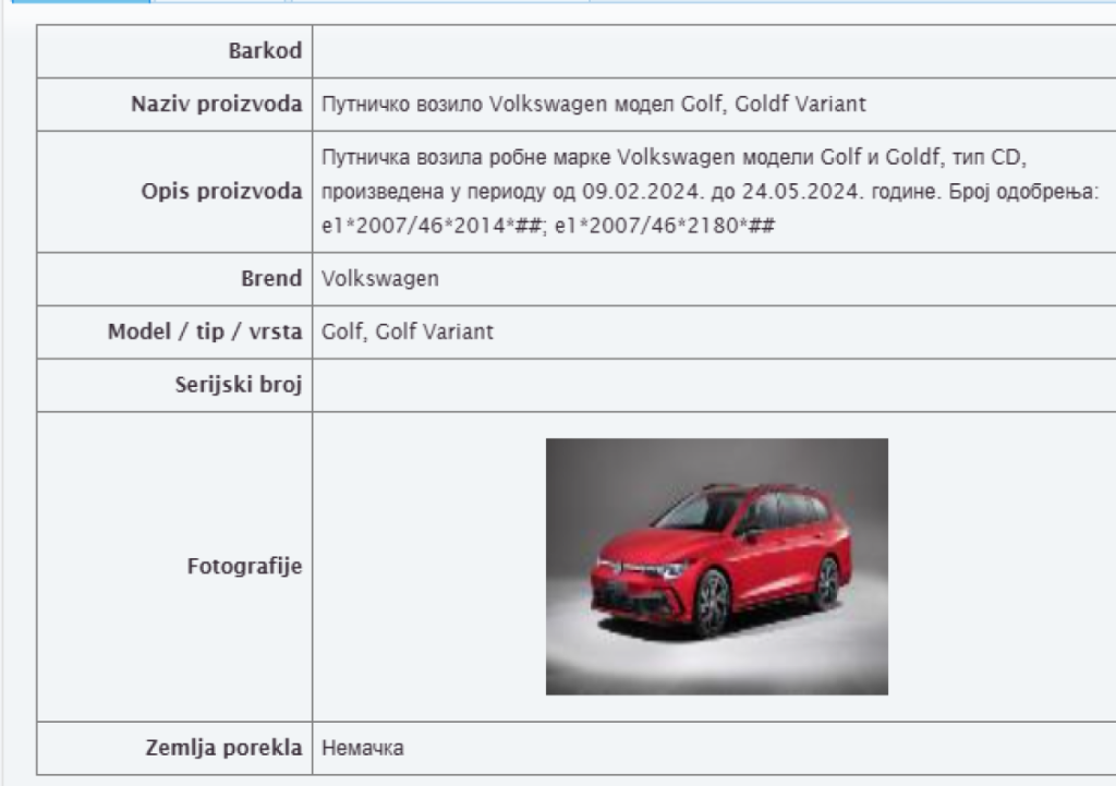 Putnička vozila robne marke Folkswagen modeli Golf i Goldf, tip CD, proizvedena u periodu od 09.02.2024. do 24.05.2024. godine. Broj odobrenja: e1*2007/46*2014*##; e1*2007/46*2180*##