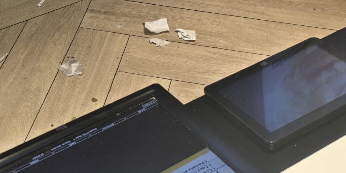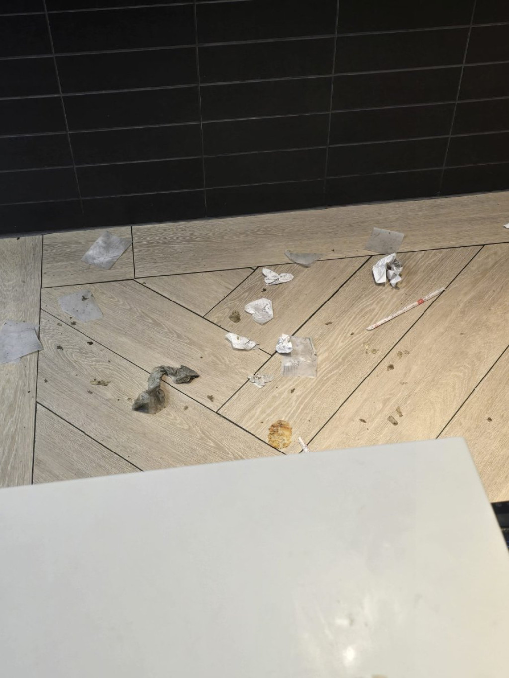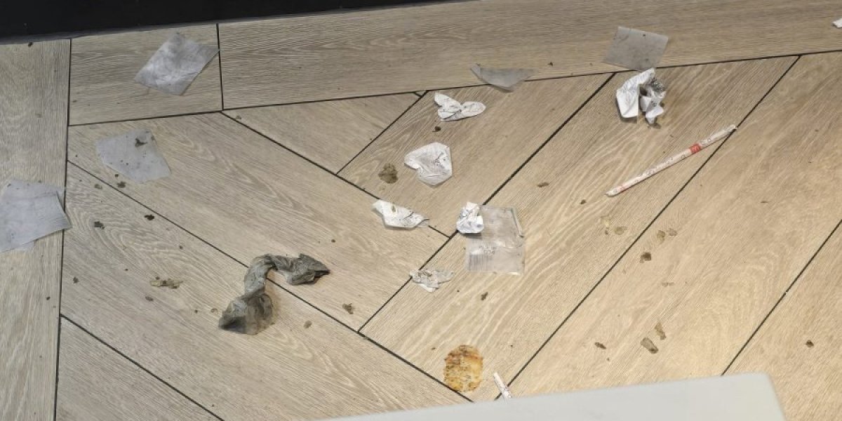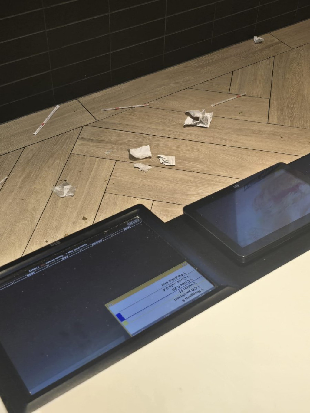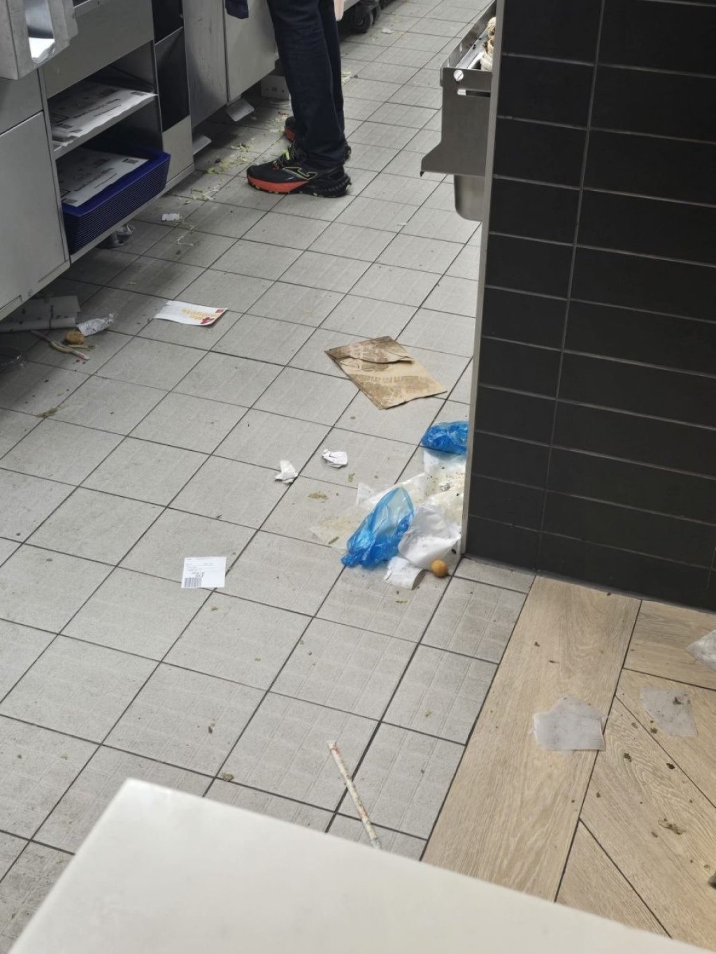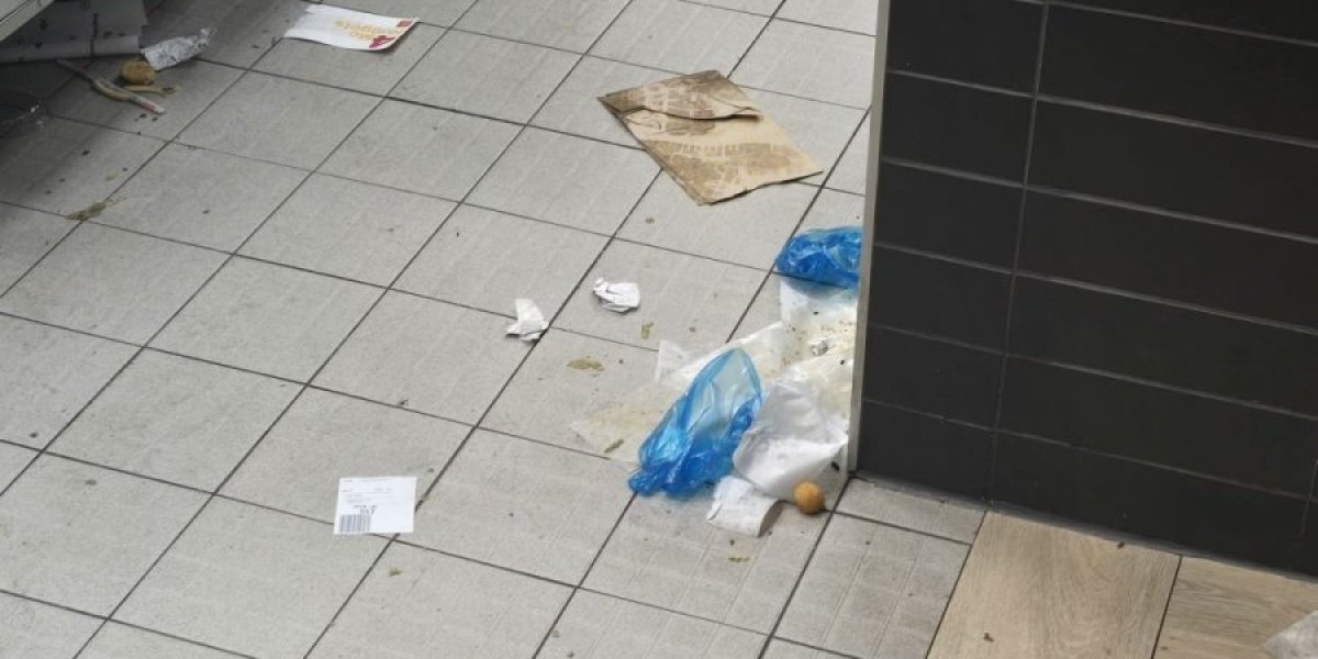 Na njima se jasno vidi gomila đubreta po podu - ostaci salate i hrane, papiri, najlon kese, slamčice, pokvašene salvete, gomila računa...