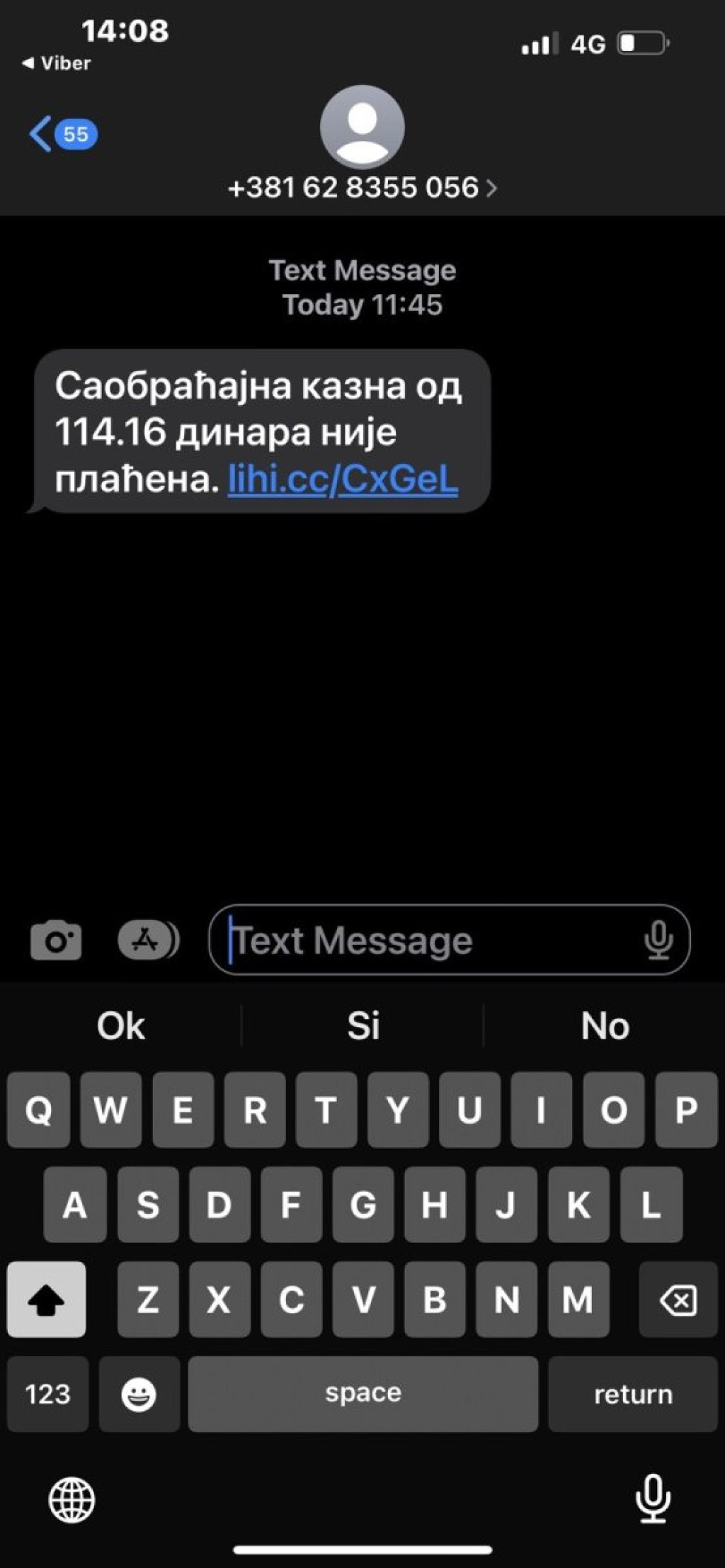 "Saobraćajna kazna od 114.16 dinara nije plaćena", piše u kraćoj poruci.