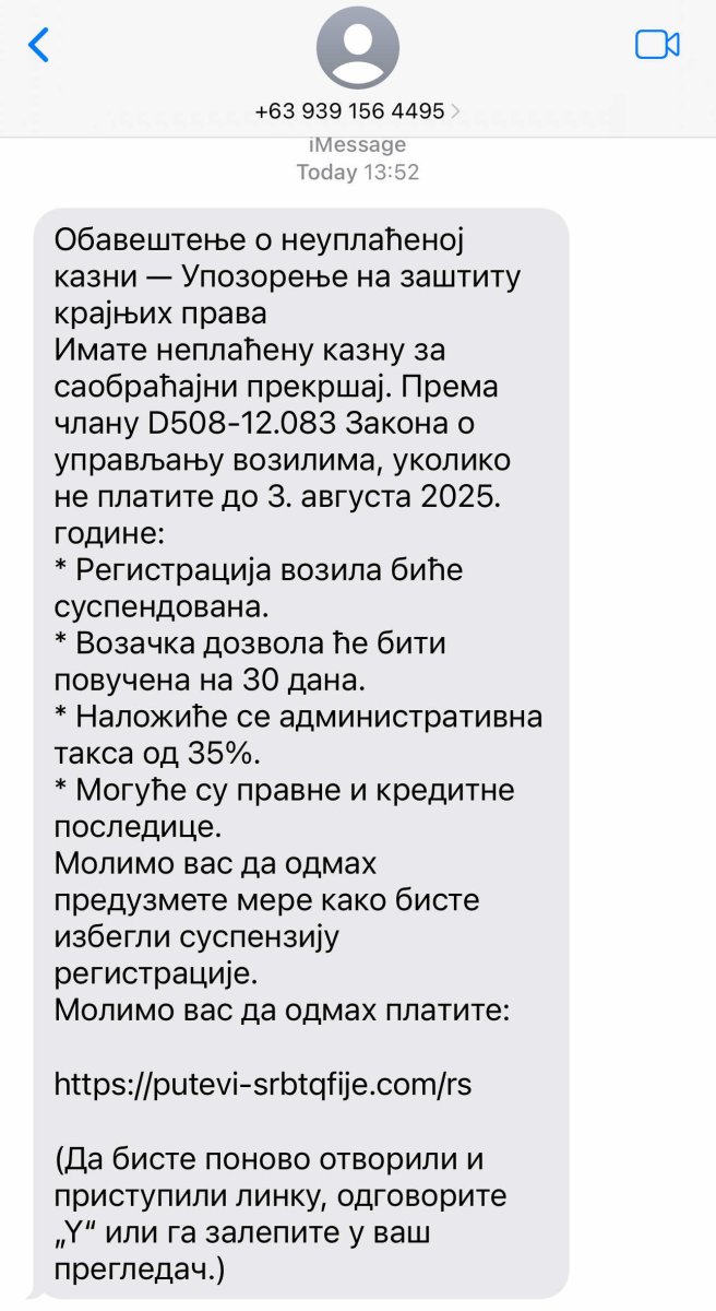 "Obaveštenje o neuplaćenoj kazni Upozorenje na zaštitu krajnjih prava Imate neplaćenu kaznu za saobraćajni prekršaj. Prema članu D508-12.083 Zakona o upravljanju vozilima, ukoliko ne platite do 3. avgusta 2025. godine: registracija vozila biće suspendovana, vozačka dozvola će biti povučena na 30 dana, naložiće se administrativna taksa od 35 odsto, moguće su pravne i kreditne posledice. Molimo vas da odmah preduzmete mere kako biste izbegli suspenziju registracije. Molimo vas da odmah platite", navedeno je u prvoj poruci i u prilogu ostavljen link.