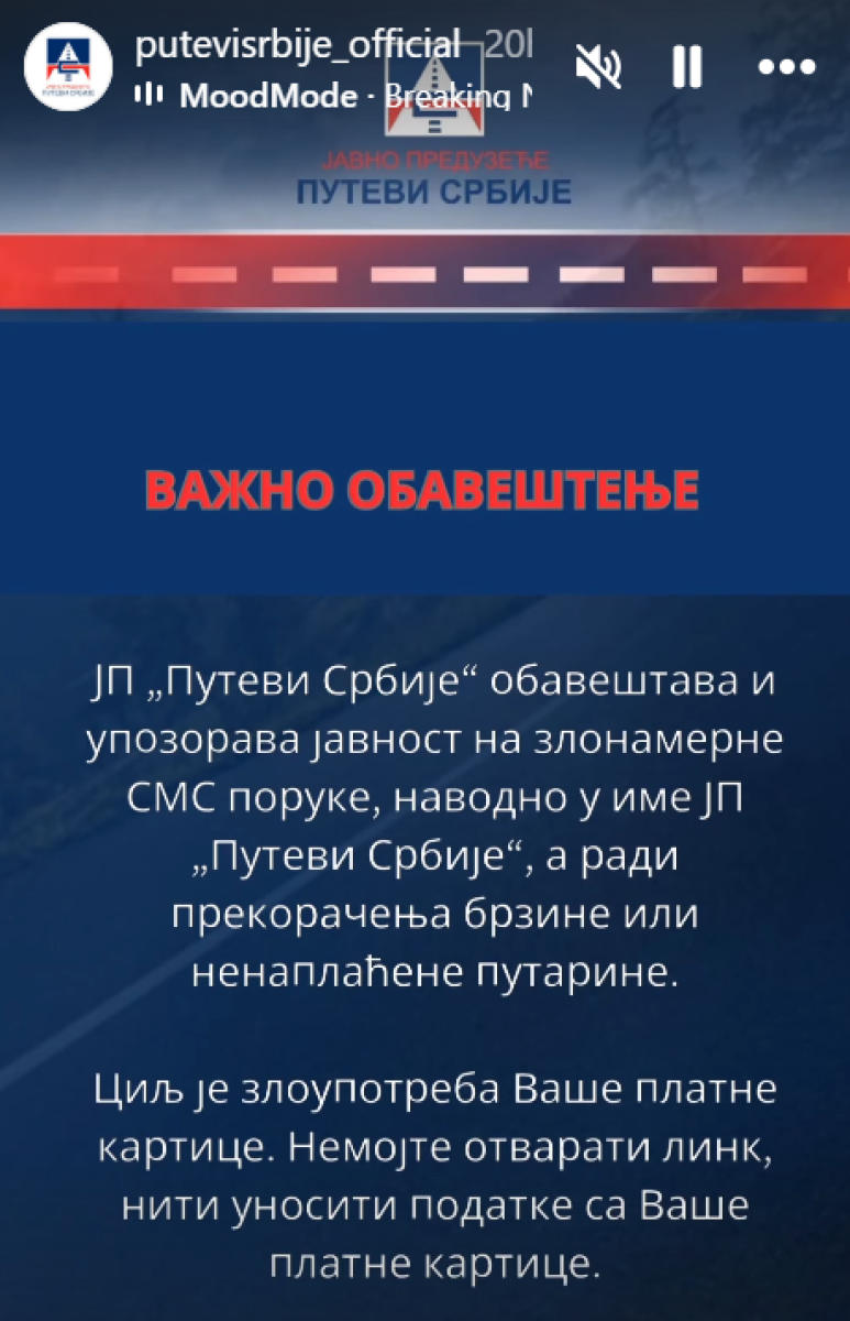 "JP "Putevi Srbije" obaveštava i upozorava javnost na zlonamerne SMS poruke navodno u ime JP "Putevi Srbije", a radi prekoračenja brzine ili nenaplaćene putarine. Cilj je zloupotreba vaše platne kartice. Nemojte otvarati link, niti unositi podatke sa vaše platne kartice", napisali su.