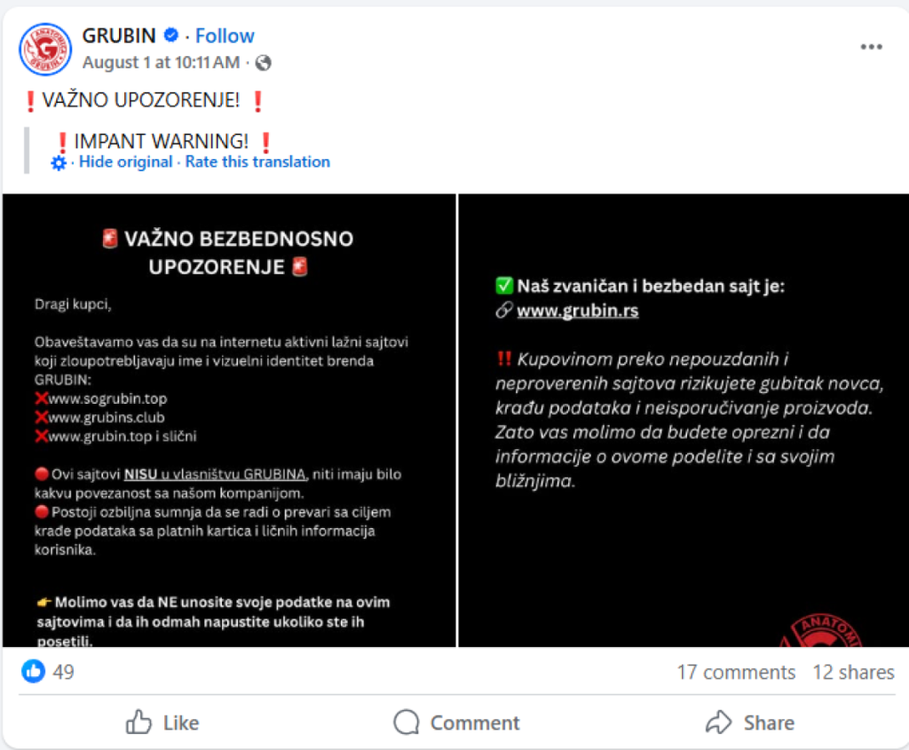 Nakon njenog iskustva, oglasio se i poznati brend papuča "Grubin", koji je takođe objavio da su u pitanju lažne stranice koje se predstavljaju u njihovo ime i upozorio potrošače da ne nasedaju na ovakve prevare, te da u slučaju sličnih problema obavezno kontaktiraju svoju banku, kako ne bi prošli isto kao ova žena.