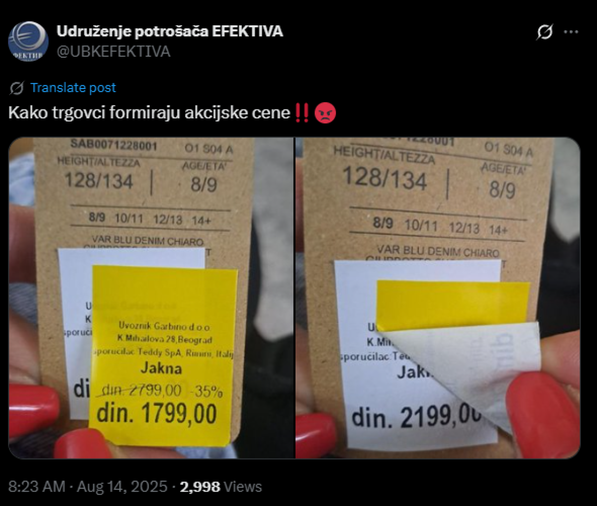 Kako su prikazali na fotografijama, oni su predstavili veliko sezonsko sniženje u kojem su cenu jednog proizvoda smanjili sa 2.799 na 1.799 dinara. I to bi bila sjajna ponuda, da je istinita! Jedan od kupaca odlepio je novu cenu, kako bi proverio staru i imao je šta da vidi.