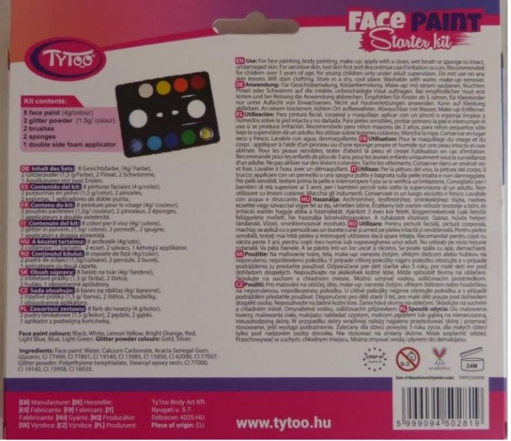 Sporni set sastoji se od osam boja, dva praha sa šljokicama, dve četkice, dva sunđera i aplikatora od pene, i sve to upakovano u kartonsku kutiju.