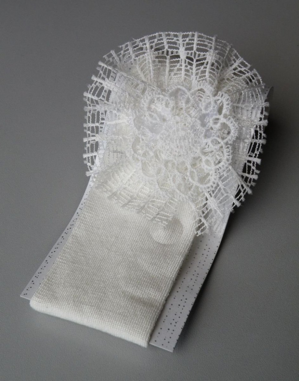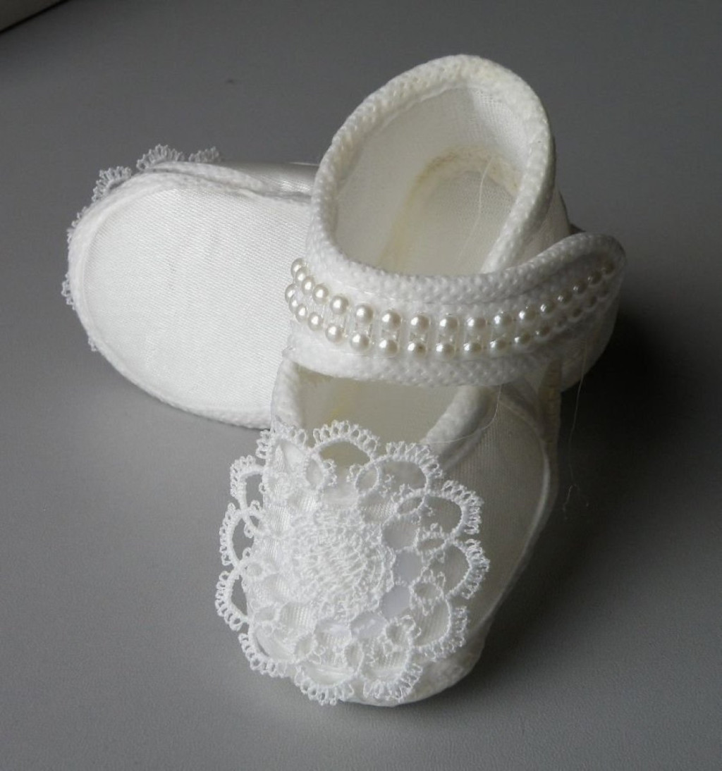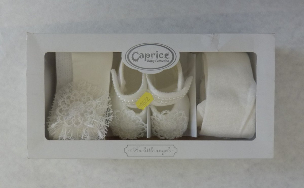 Komplet je za devojčice, bele boje, i sastoji se od cipelica, trake za glavu i čarapa.