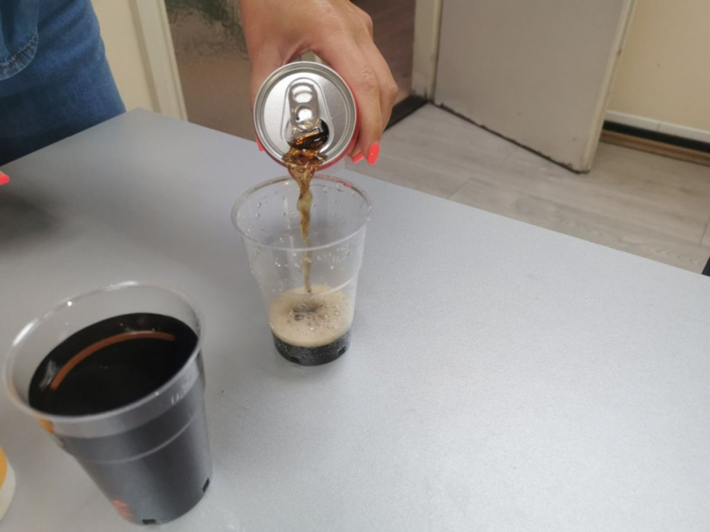 Najveći šok je bio kada smo uporedili boju - dok je tečnost iz limenke bila tamnobraon i delovala sveže i gazirano, "koka-kola" iz "Mekdonaldsa" izgledala je kao da je razblažena sa običnom vodom, bar u odnosu pola-pola. Delovala je poput čaja, svetlobraon boje, bez ikakvog ukusa. Posle dva gutljaja, primetili smo da je bljutava, pogotovo kada više nije bila hladna. Zaključak je bio jasan - u toj ambalaži, osim imena, ništa nije bilo ni približnog kvaliteta.
