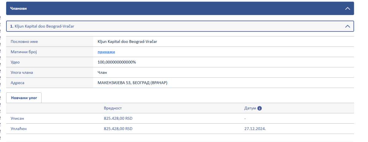 Još zanimljivije je što članstvo Kljun Kapitala nema istaknut datum kada je postao deo Digital Azuta, iako je jasno navedeno da iznos udela ove saradnje iznosi 825.428 dinara, a ono što skreće pažnju jeste činjenica da je baš 825.428 dinara uplaćeno u jednom danu, tačnije 27. decembra 2024. godine, iako i pre i nakon tog datume nema javno evidentiranih uplata.