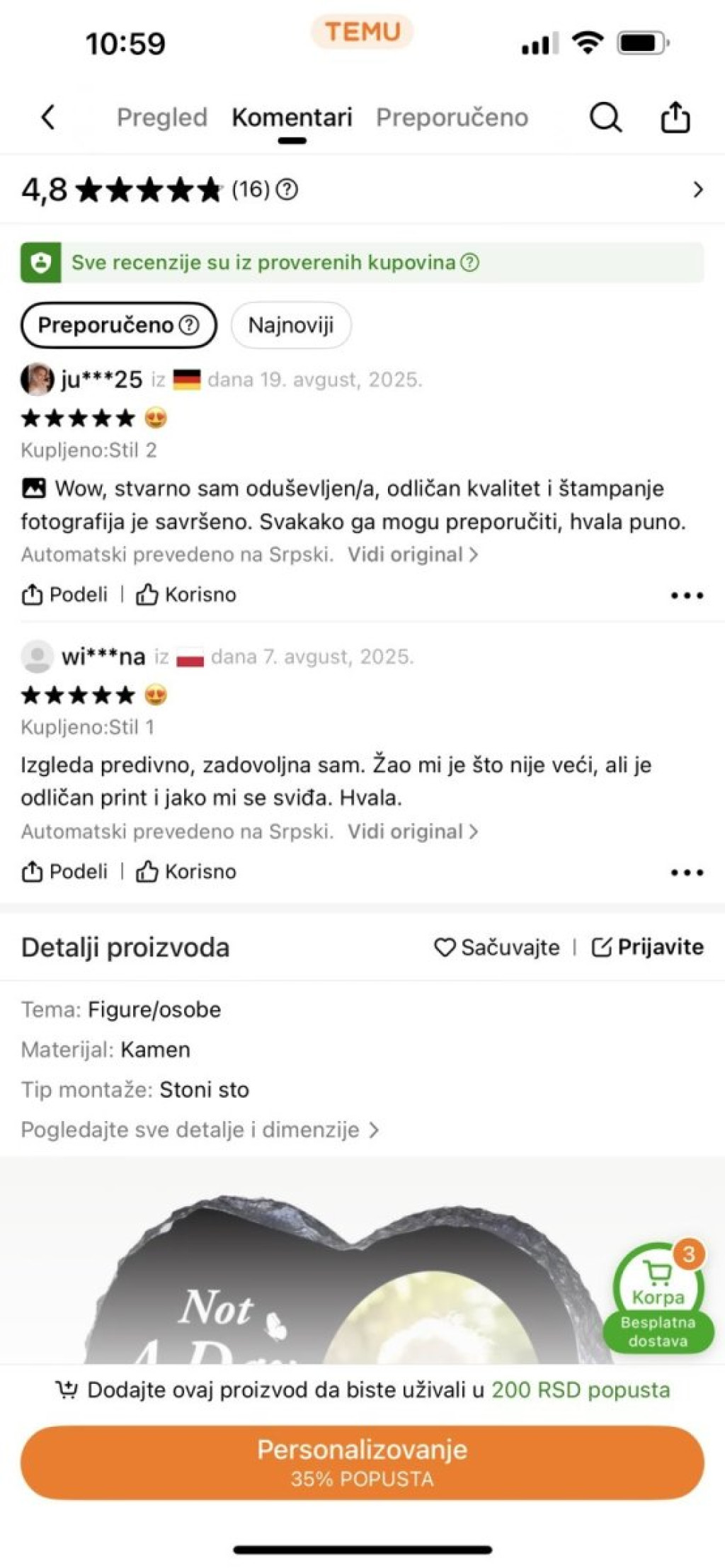 Komentari i ocene ovih proizvoda ukazuju samo na jedno - postoje ljudi koji su se odlučili na bitan korak i naručili sa "Temu" aplikacije nadgrobne ploče i fotografije najmilijih preminulih osoba.