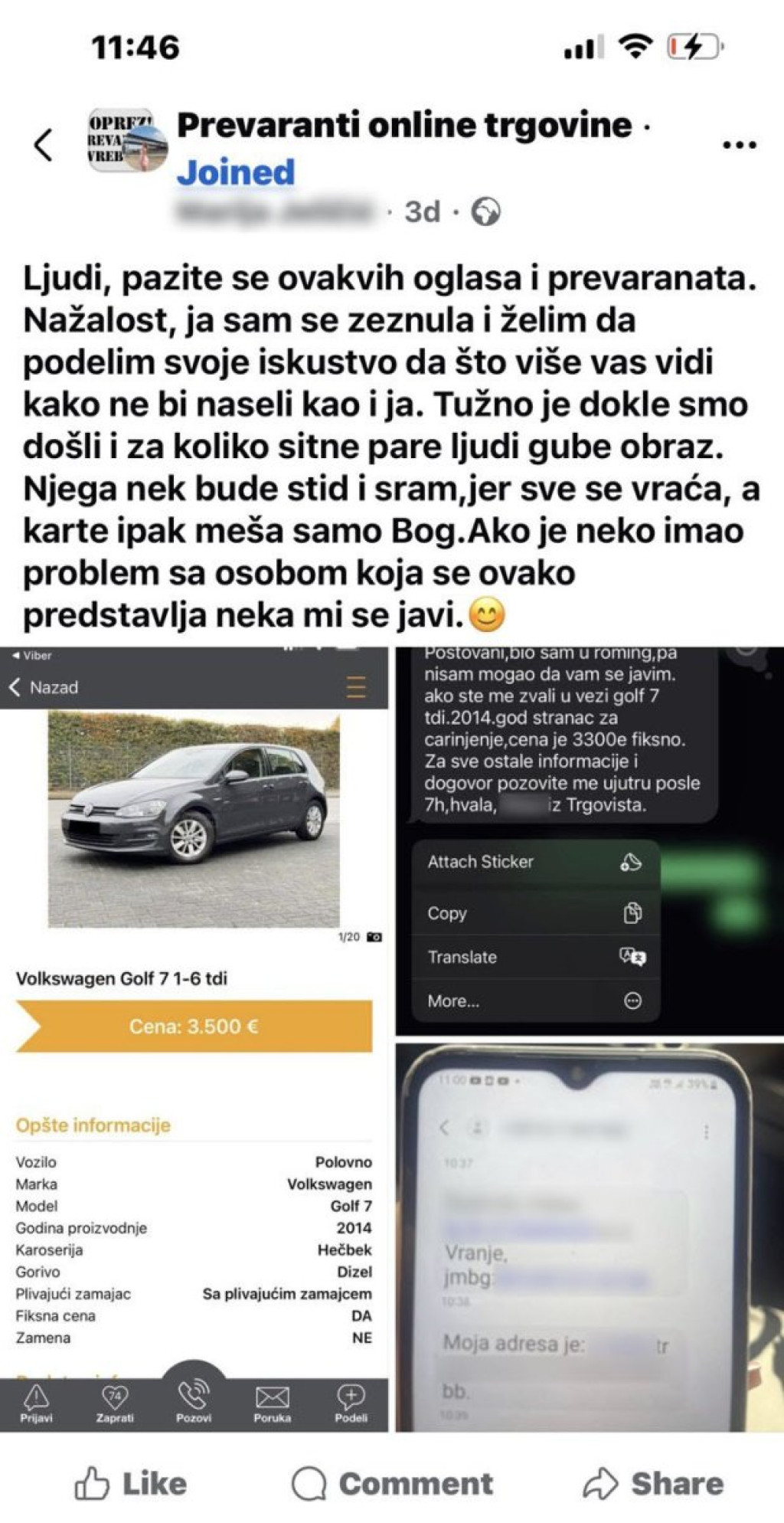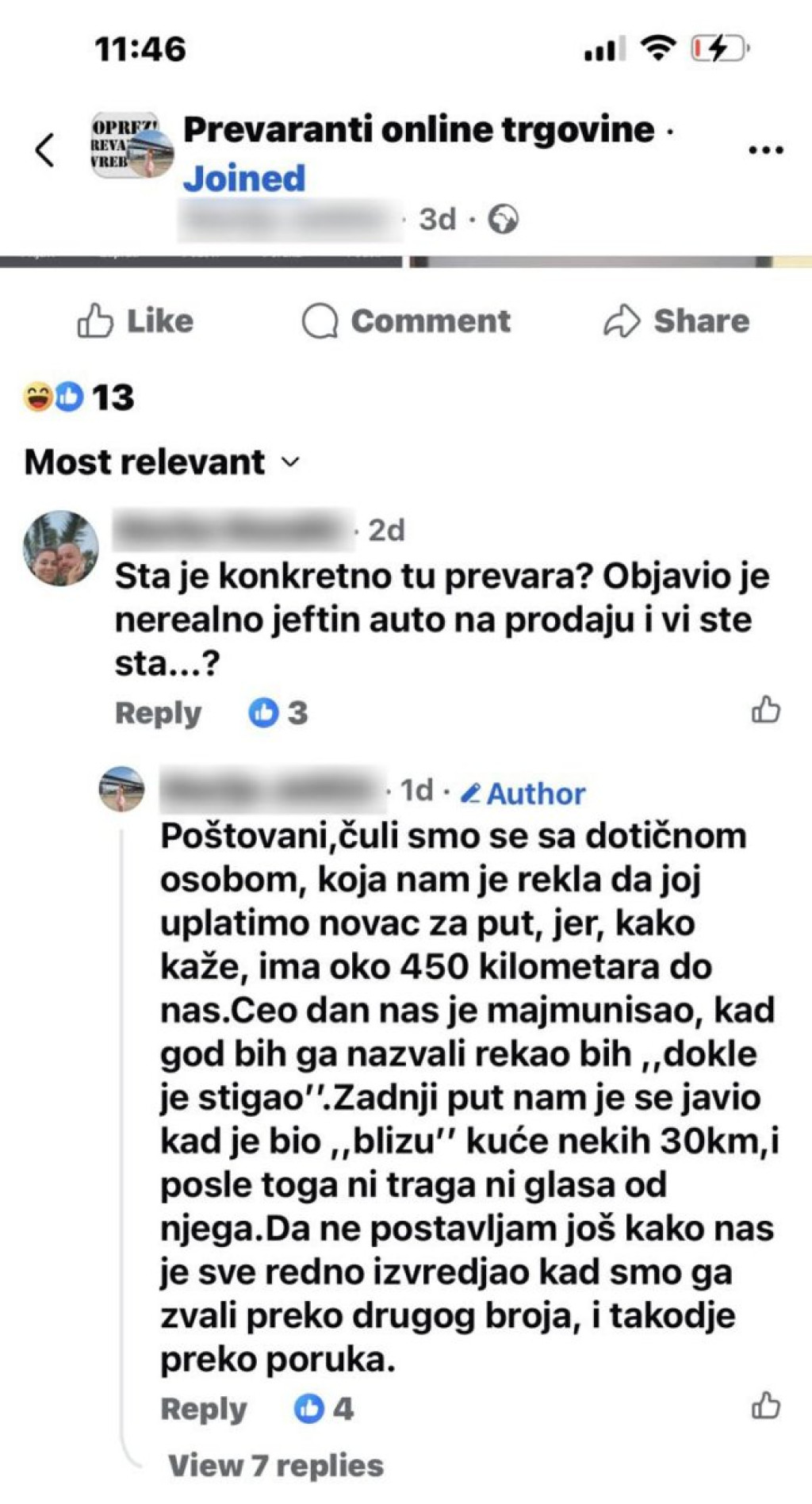 Komentari drugih članova grupe dugo su se nizali i svi su imali istu poruku: ukoliko uočite oglas sa nerealno niskom cenom automobila - nikako ne nasedajte!