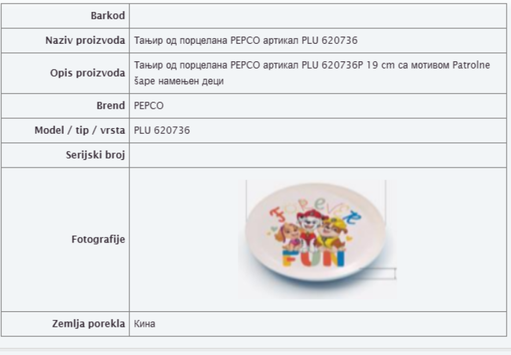 "Zbog prekoračenja migracije olova, proizvod nije u skladu sa zahtevima koji se odnose na keramičke proizvode namenjene za kontakt sa hranom, i ima negativan uticaj na zdravlje i bezbednost korisnika", navodi se na sajtu NEPRO.