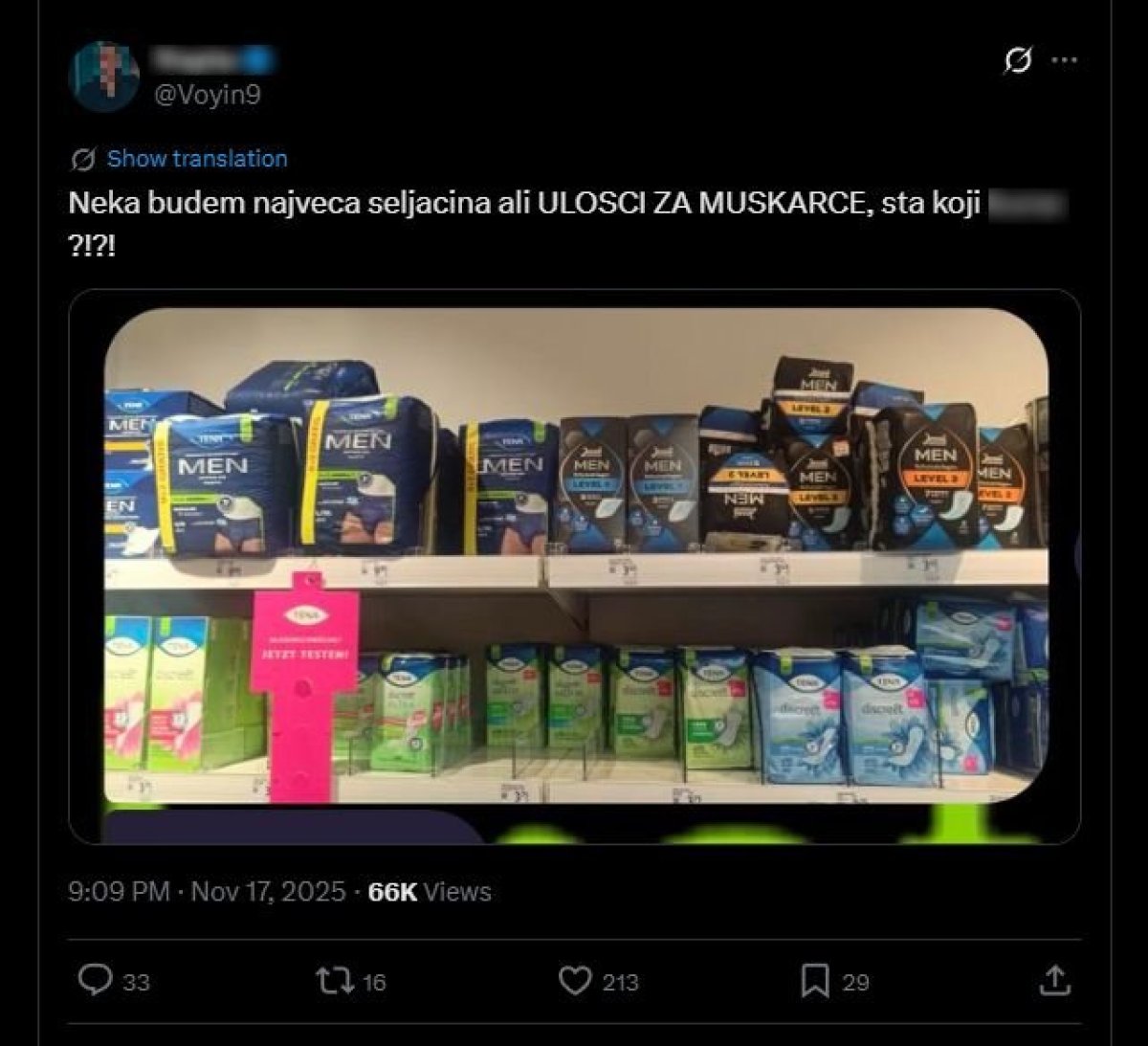 Naime, jedan korisnik na društvenim mrežama burno je reagovao kada je saznao da se ulošci za muškarce prodaju u Srbiji.