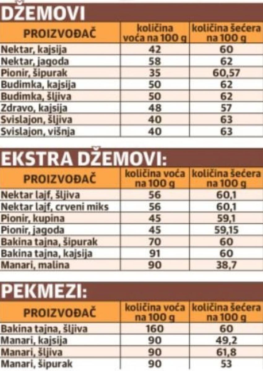 U slatkim namazima, džemovima i pekmezima koje poroizvode "Nektar", "Pionir", "Svislajon", "Bakina tajna", "Manari", "Zdravo" i "Budimka" šećera ima više nego voća, pokazalo je naše istraživanje.