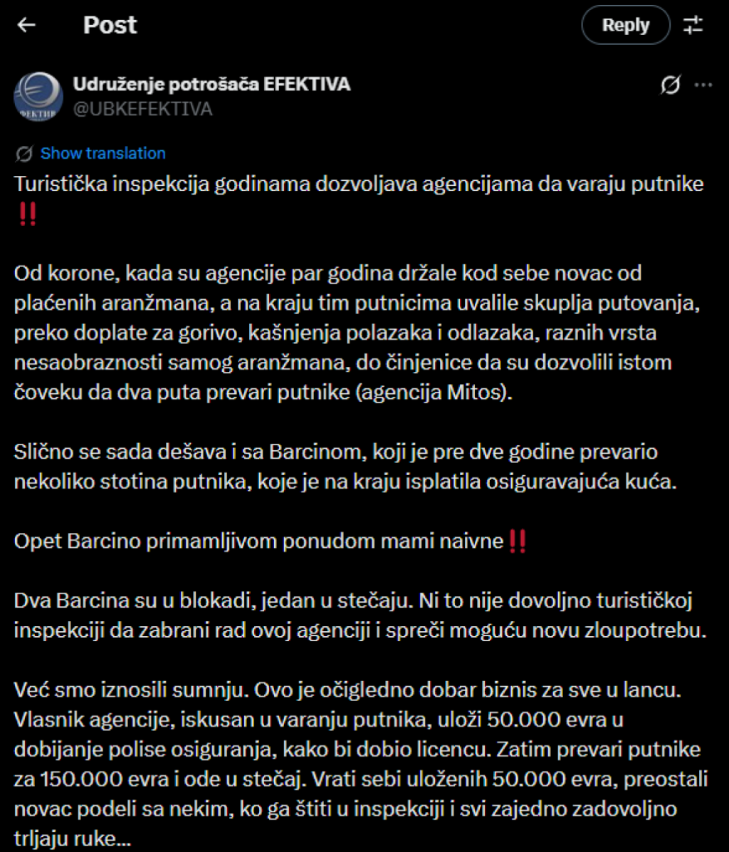 Slična situacija zabeležena je i sa agencijom Barcino, koja je pre dve godine prevarila nekoliko stotina putnika.