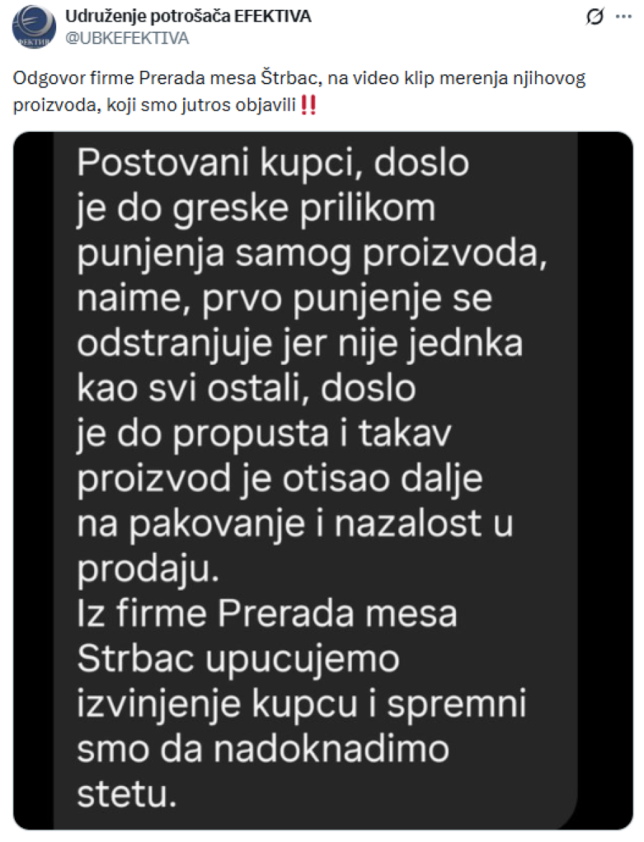 Nakon toga što je "Efektiva" upozorila potrošače na šunku iz proizvodnje "Štrbac", koje ima 100 grama manje od naznačene količine na pakovanju, oglasili su se iz kompanije.