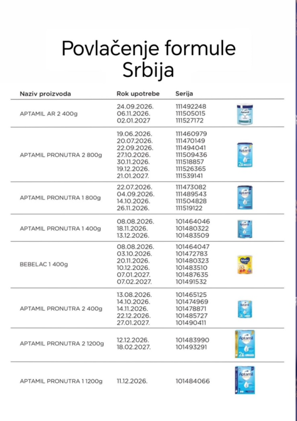 Podsetimo, formule za hranjenje beba "Aptamil" i "Bebelac" povučene su sa tržišta Srbije i zemalja EU, a nedavno su bili upozoreni i potrošači iz Hrvatske.