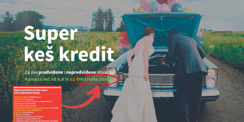 Ali banke ne bi bile banke kada ne bi našle caku da zarade i nadoknade ono čega su se odrekle. Za oko nam je zapao Super keš kredit koji kroz reklamu nudi Sber banka. Ovu pozajmicu promovišu pod parolom "bez troškova obrade", što na prvi pogled zvuči i te kako primamljivo. Jer svako ko je podizao kredit zna da mu je ova stavka iz džepa isterivala po nekoliko hiljada dinara (1,5 do 2 odsto od ukupnog iznosa kredita). Međutim, kada detaljno proučite uslove pod kojima se uzima ova pozajmica, brzo ćete shvatiti da će vam u Sberu na sitno, mesec po mesec, uzeti ozbiljnu sumu novca, koja bi mogla da bude i nekoliko puta veća od one koju su ranije uzimali pod stavkom "obrada kredita".