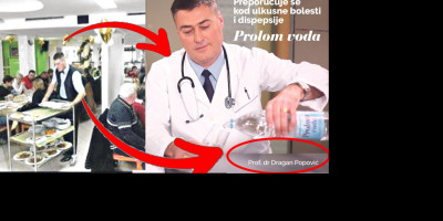 Da zlo bude veće, na plakatu sa kog se poručuje potrošačima da je "prolom" voda preporučljiva kod ulkusne bolesti i dispepsiju potpisan je profesor doktor Dragan Popović, i to ispod fotografije na kojoj je zapravo ugostitelj Aleksandar Vujić, ali u lekarskoj, umesto u konobarskoj uniformi.