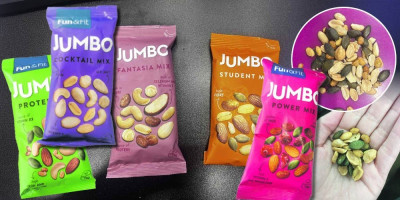 I, "Jumbo Fantasia mix" u svojih 75 grama ima po 29 odsto kikirija i suvog grožđa. Dok se indijski orah, badem i lešnik nalaze, moemo slobodno reći, u tragovima, po par komada.