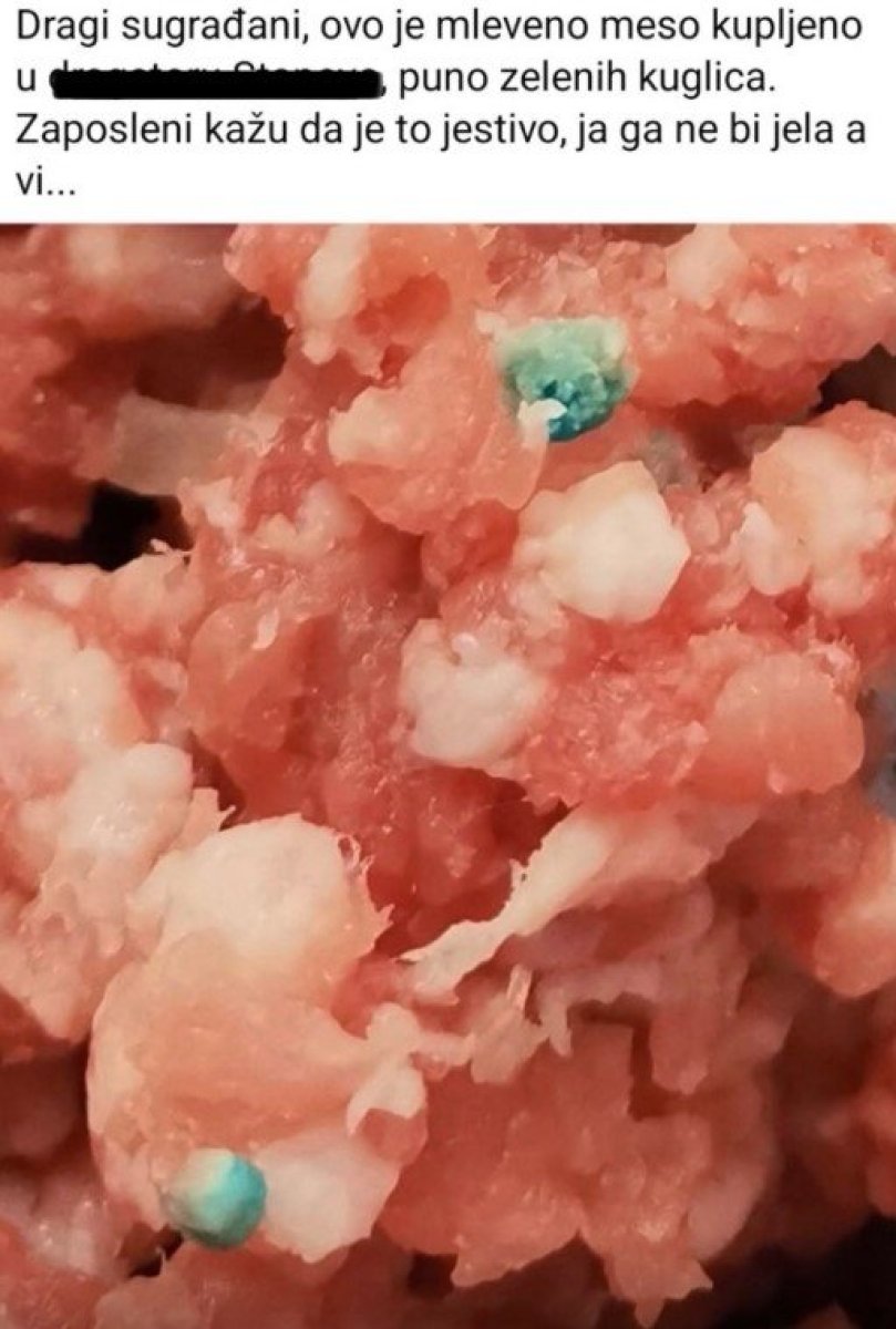 - Dragi sugrađani, ovo je kupljeno mleveno meso puno zelenih kuglica. Zaposleni kažu da je to jestivo, ja ga ne bih jela, a vi... - napisala je ona na platformi "Facebook".
