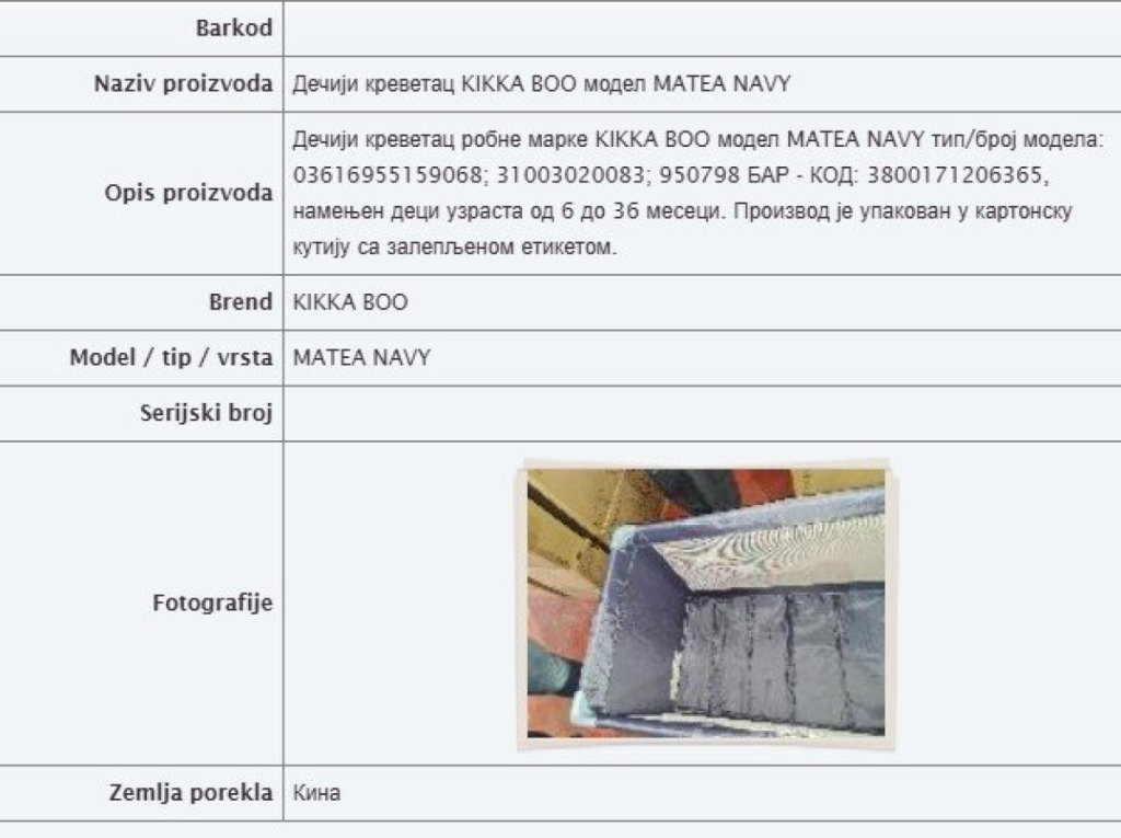 Za srpskog tržišta se povlači dečiji krevetac robne marke KIKKA BOO model MATEA NAVY, tip i broj modela 03616955159068; 31003020083; 950798 sa bar kodom 3800171206365.