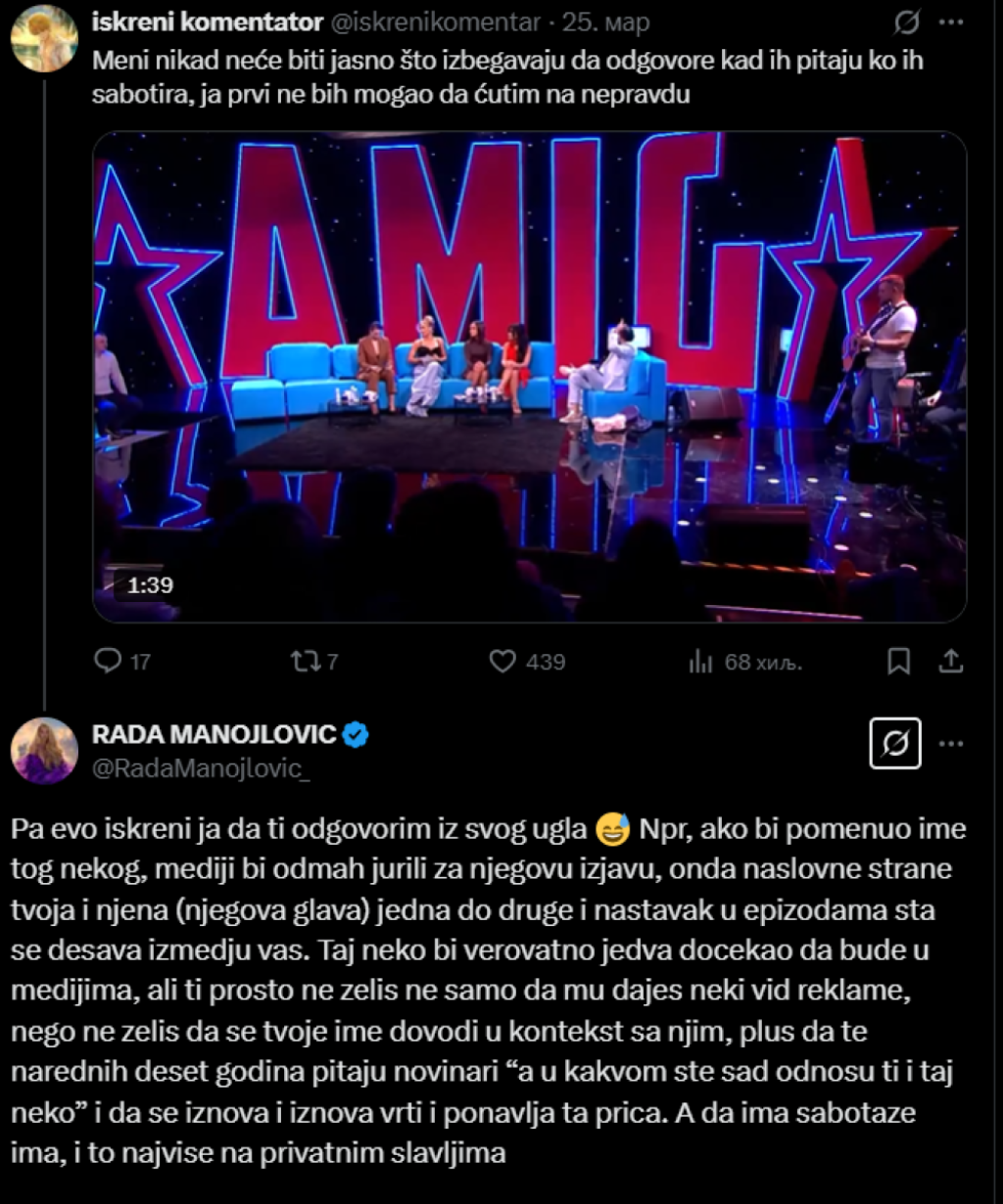 Nadeždinu izjavu na društvenim mrežama prokomentarisala je Rada Manojlović i otkrila kako se i sama suočava sa sličnim problemima.