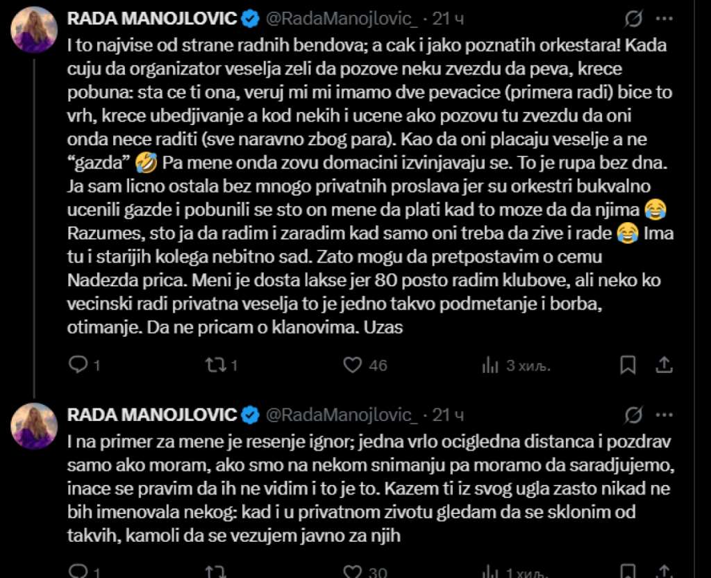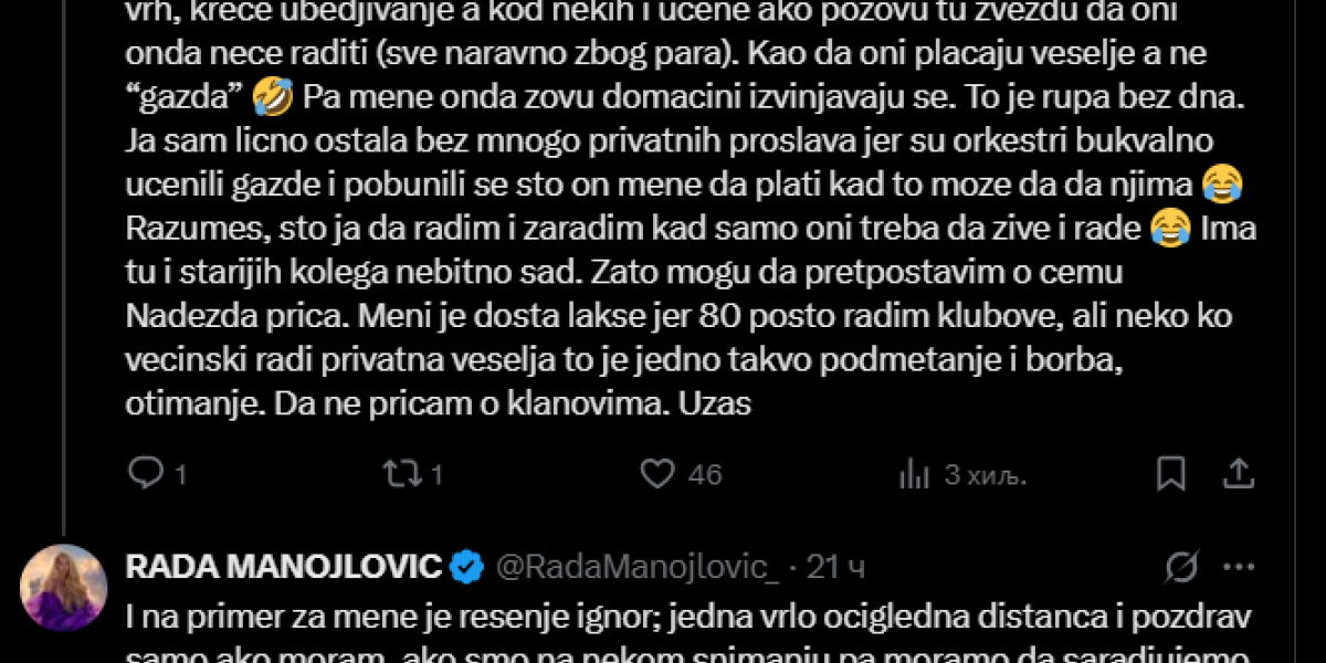 - Razumeš, što ja da radim i zaradim kad samo oni treba da žive i rade. Ima tu i starijih kolega nebitno sad. Zato mogu da pretpostavim o čemu Nadežda priča. Meni je dosta lakše jer 80 odsto radim klubove, ali neko ko većinski radi privatna veselja to je jedno takvo podmetanje i borba, otimanje. Da ne pričam o klanovima. Užas - zaključila je Manojlovićeva.