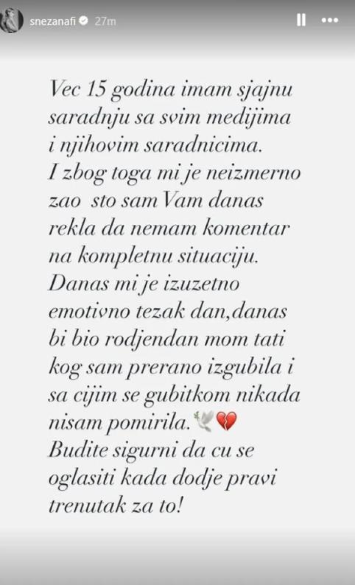 - Već 15 godina imam sjajnu saradnju sa svim medijima i njihovim saradnicima. I zbog toga mi je neizmerno žao sto sam vam danas rekla da nemam komentar na kompletnu situaciju - napisala je.