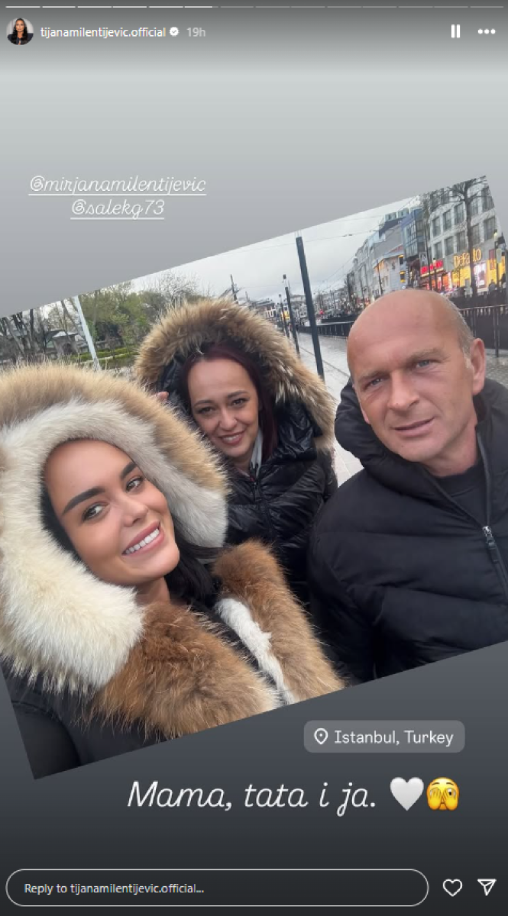 Tijana je svoje roditelje Mirjanu i Sašu odvela u grad na Bosforu, a njih troje zajedno uživaju u razgledanju znamenitosti koje Istanbul nudi. Pevačica se odmah pohvalila na društvenim mrežama objavivši fotografiju na kojoj vedri i nasmejani obilaze jedan od najlepših turskih gradova, a u oči odmah upada da Tijana veoma liči na svoju mamu.