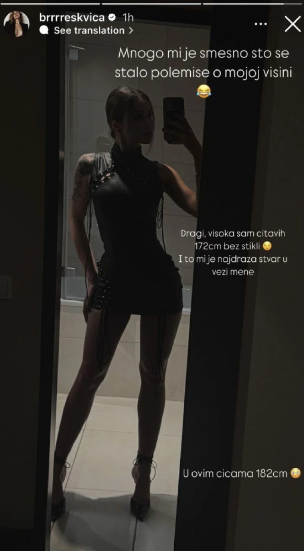 - Mnogo mi je smešno što se stalno polemiše o mojoj visini. Dragi, visoka sam čitavih 172 cm bez štikli i to mi je najdraža stvar u vezi mene - napisala je Breskvica, a kako na fotografiji koju je komentarisala nosi štike, istakla je da su joj one dale još 10 cm na na visini: