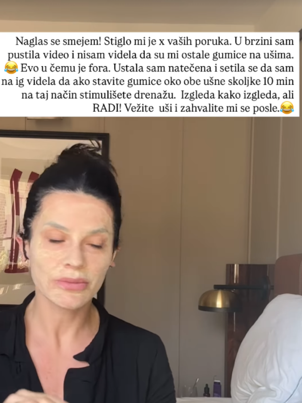 "Naglas se smejem. Stiglo mi je X vaših poruka. U brzini sam pustila video i nisam videla da su mi ostale gumice na ušima. Evo u čemu je fora. Ustala sam natečena i setila se da sam na Instagramu videla da ako stavite gumice oko obe ušne školjke 10 minuta na taj način stimulišete drenažu. Izgleda kako izgleda, ali radi! Vežite uši i zahvalite mi posle", napisala je ona i dodala nekoliko smajlija.