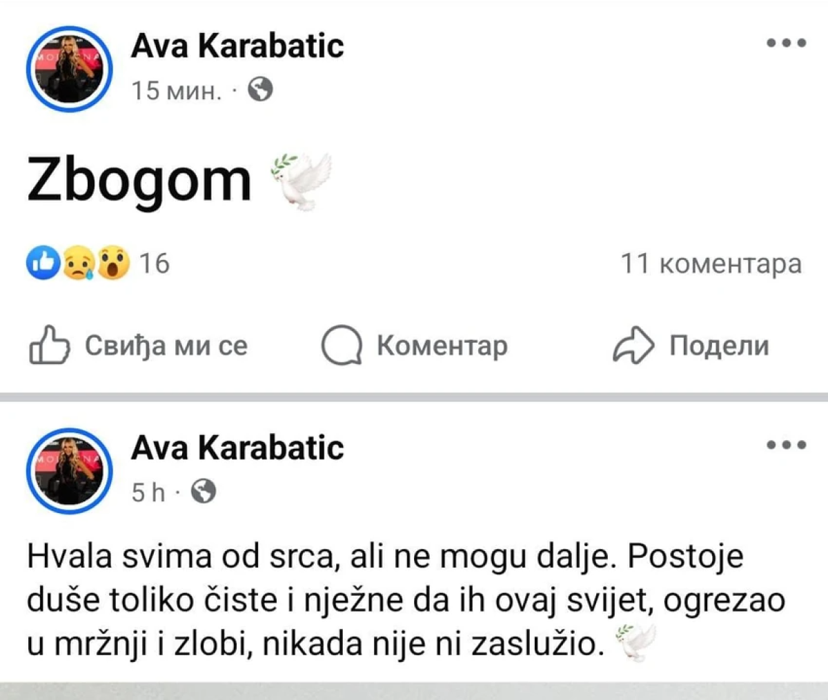 Ava Karabatić naglasila je da nikada nije želela da digne ruku na sebe, već da je tu poruku napisao njen admin.