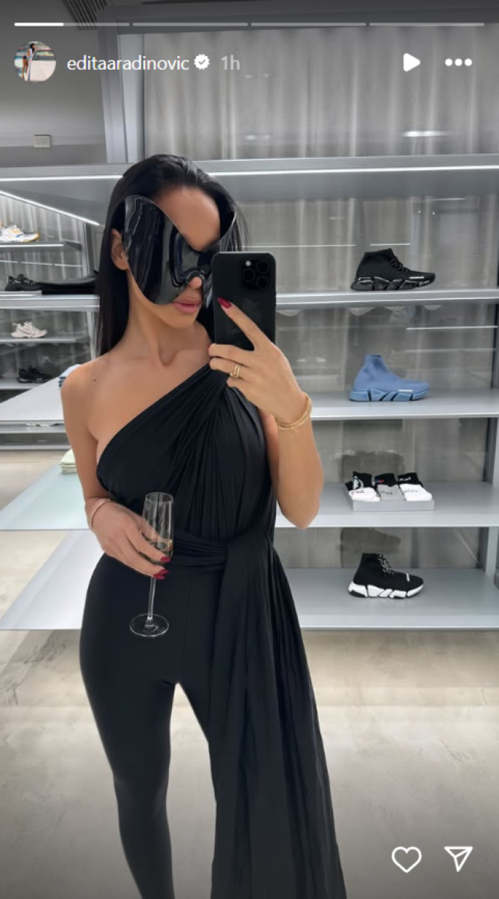 Edita je pozirala u ateljeu luksuznog brenda "balensijaga", noseći crni kombinezon i masivne naočare – identične onima koje Jelena Karleuša često nosi u svojim javnim nastupima. U ruci je držala čašu šampanjca, a kosu je pustila niz ramena, pozirajući samouvereno i izazovno.