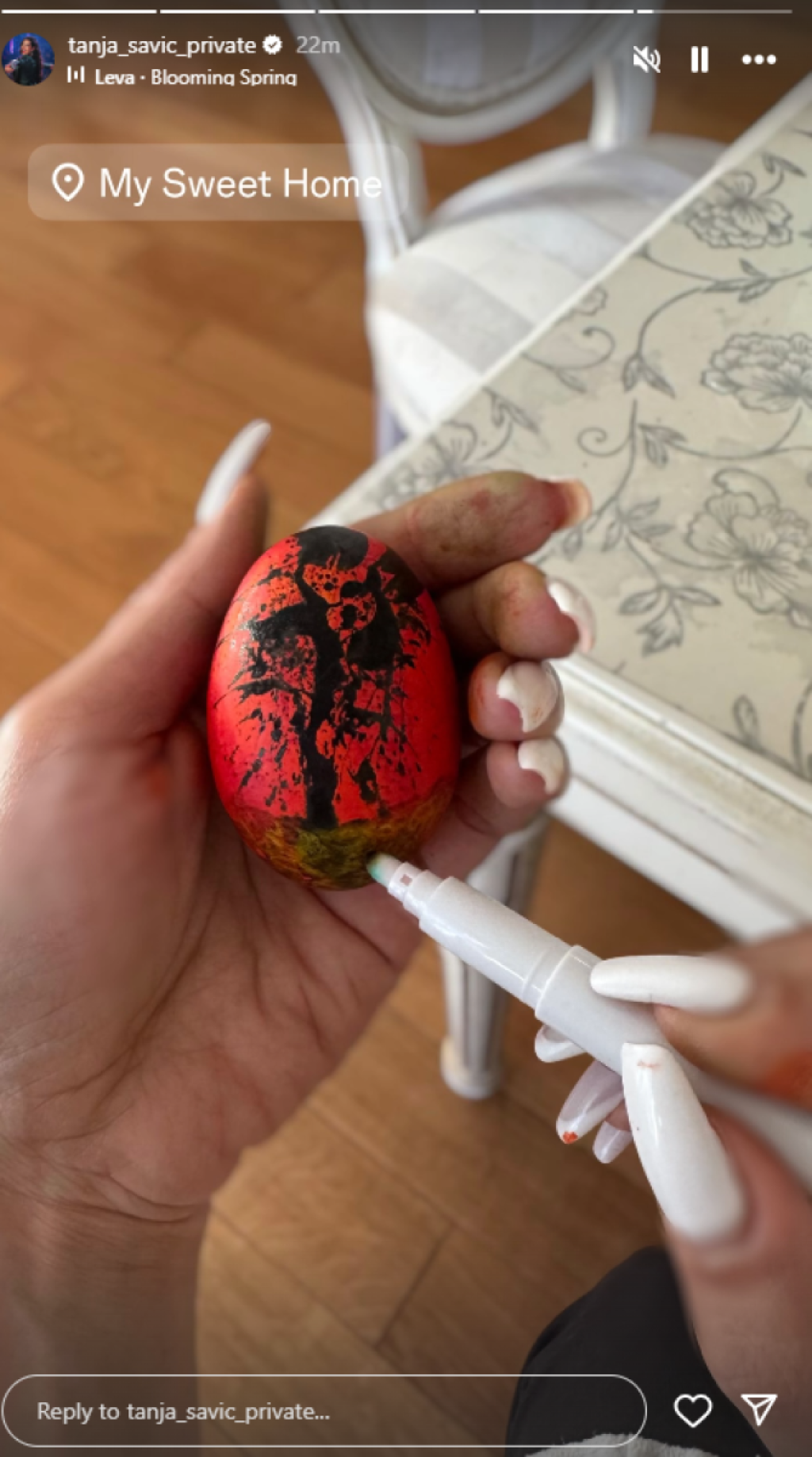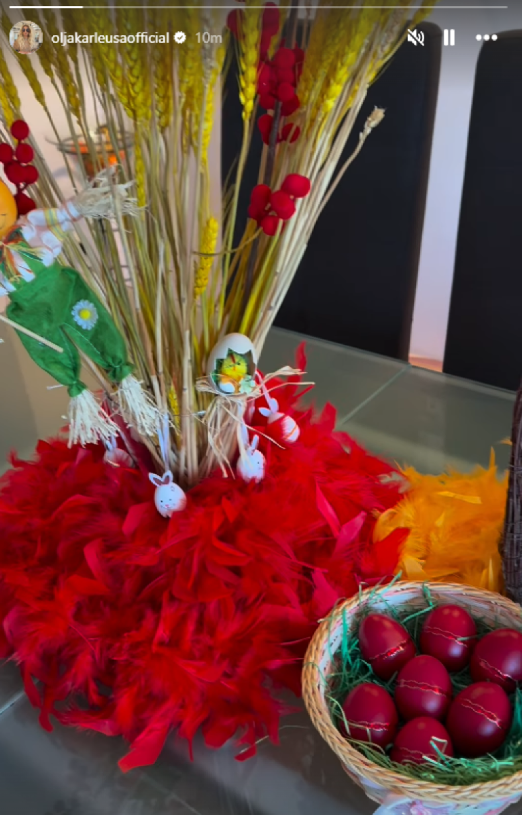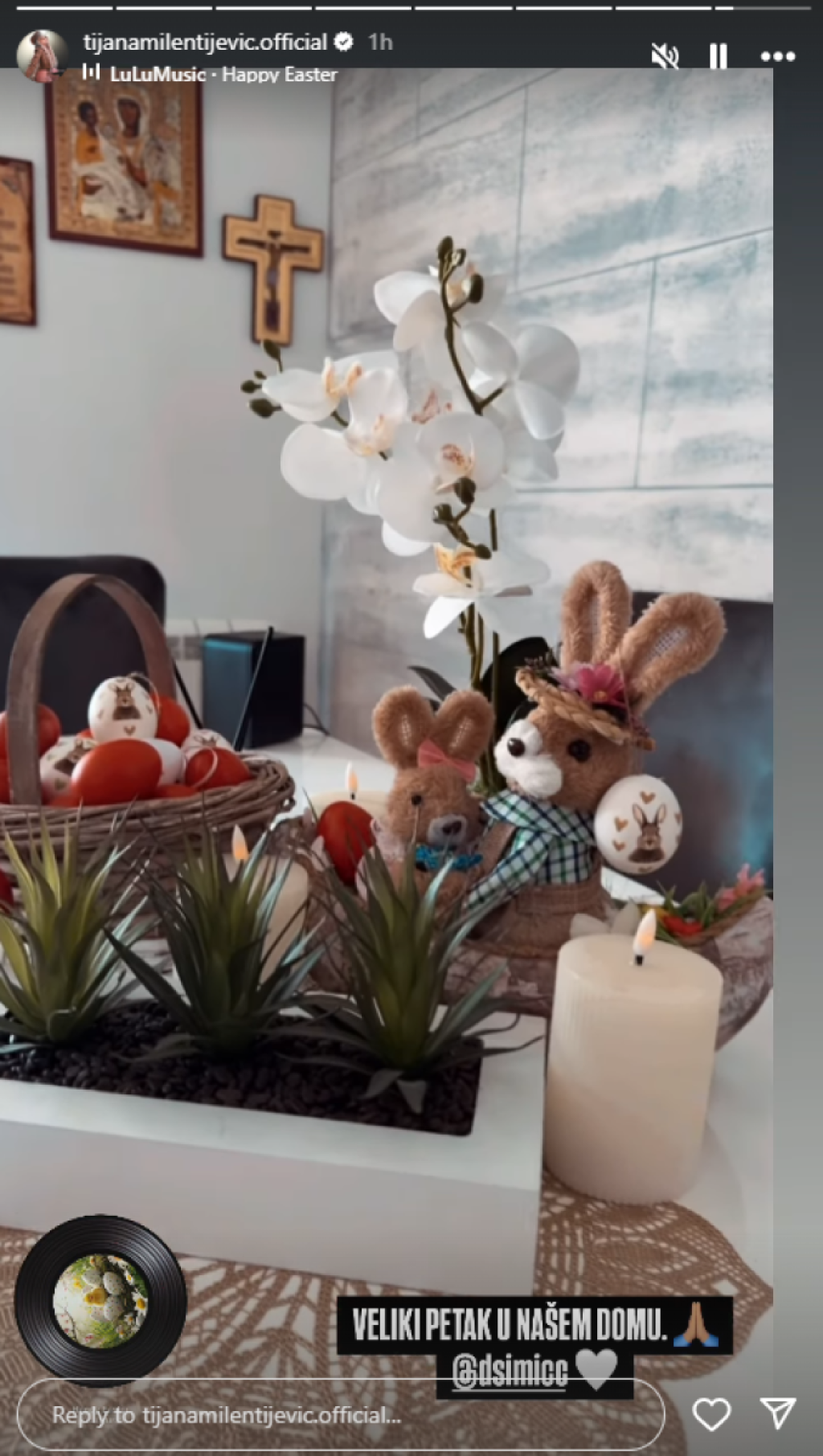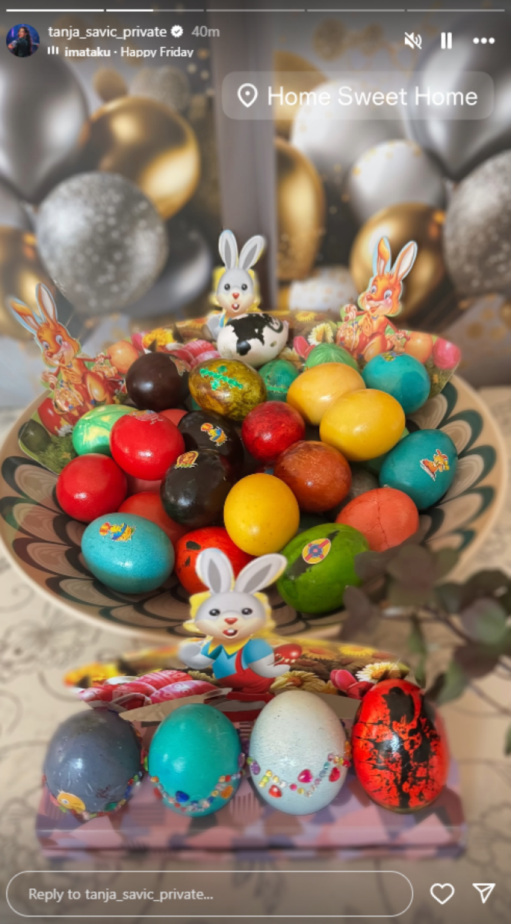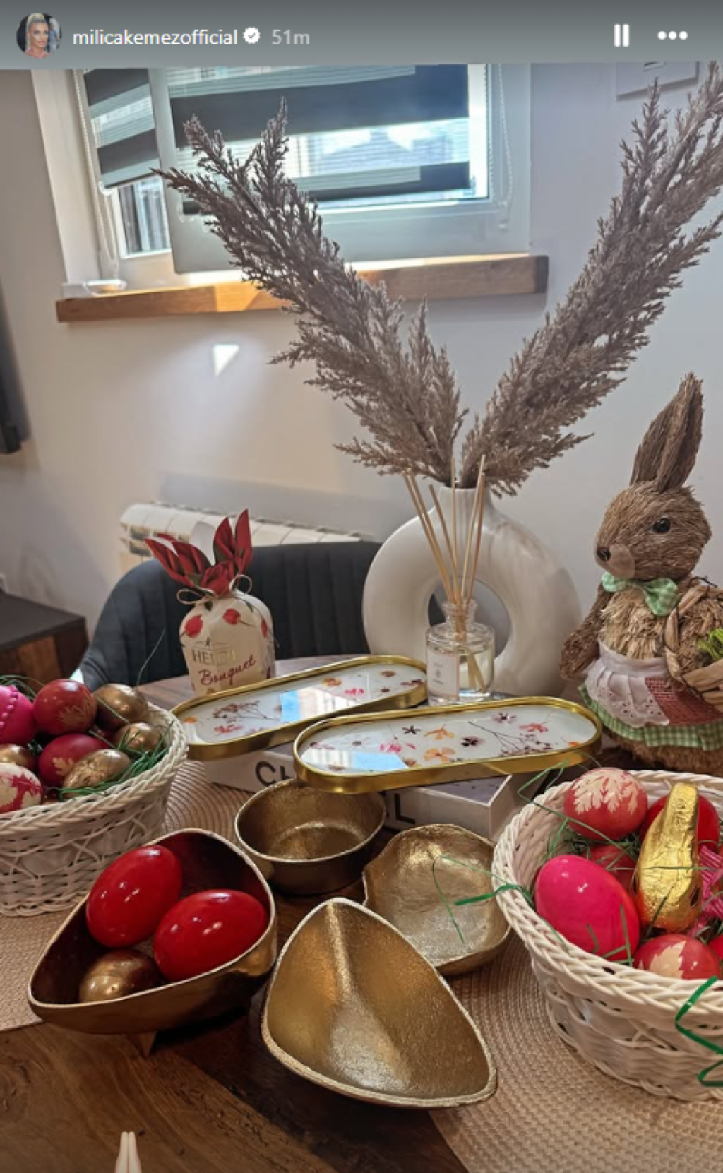 Sudeći po najnovijim objavama na Instagramu, Tijana Milentijević prava je domaćica. Košarica sa šarenim jajima našla se na njenom stolu, a figure u obliku zečeva ulepšale su prizor.