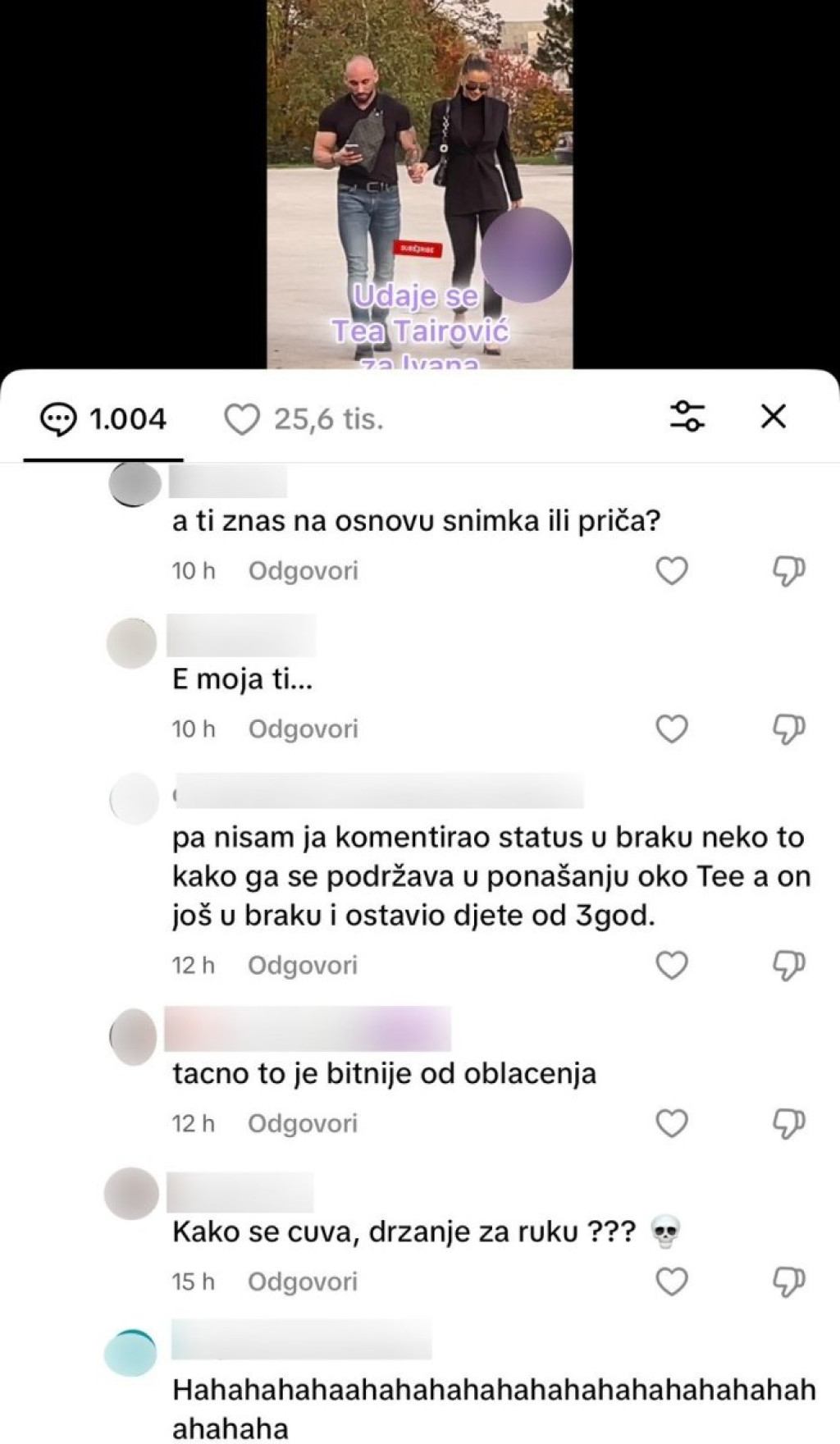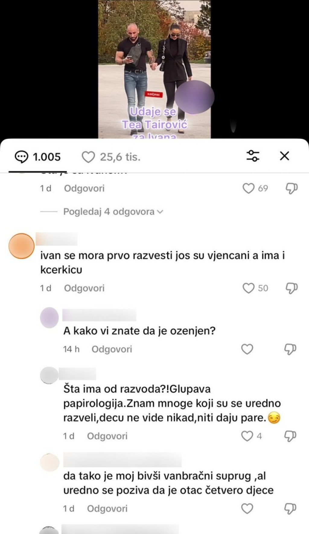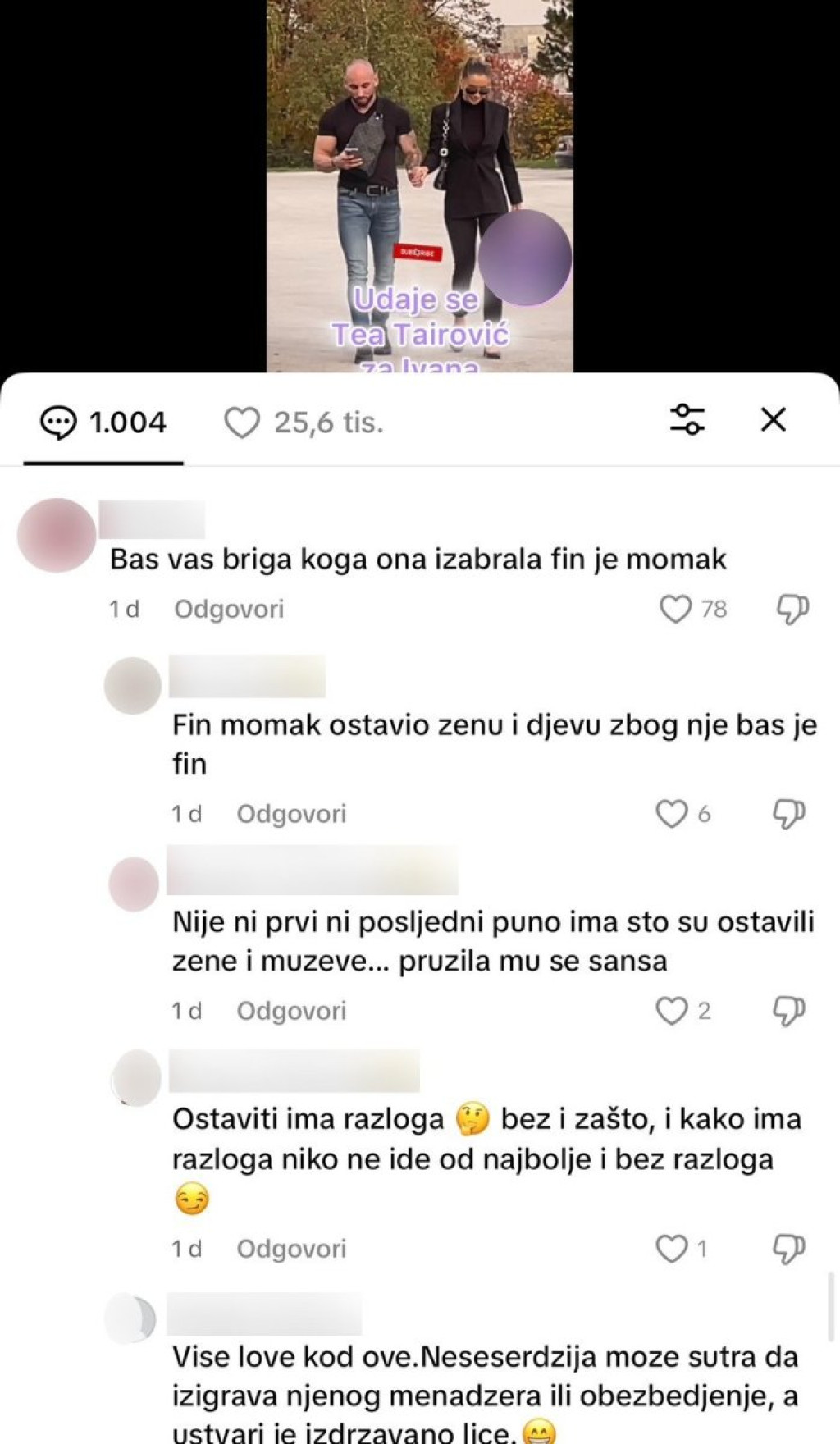 "On je bio oženjen i ima ćerku", "Čovek je bio u braku", "On je već bio oženjen, opet staje na ludi kamen?", samo su neki od mnogobrojnih komentara ispod jednog videa na kojem su Tea i Ivan.