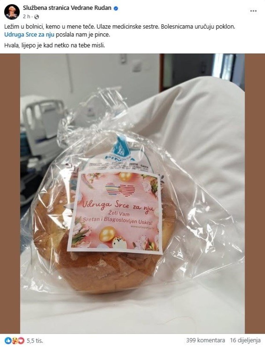 - Ležim u bolnici, hemioterapija mi teče. Ulaze medicinske sestre. Bolesnicima uručuju poklone. Udruga 'Srce za nju' poslala nam je pince. Hvala, lepo je kad neko misli na tebe - napisala je književnica.