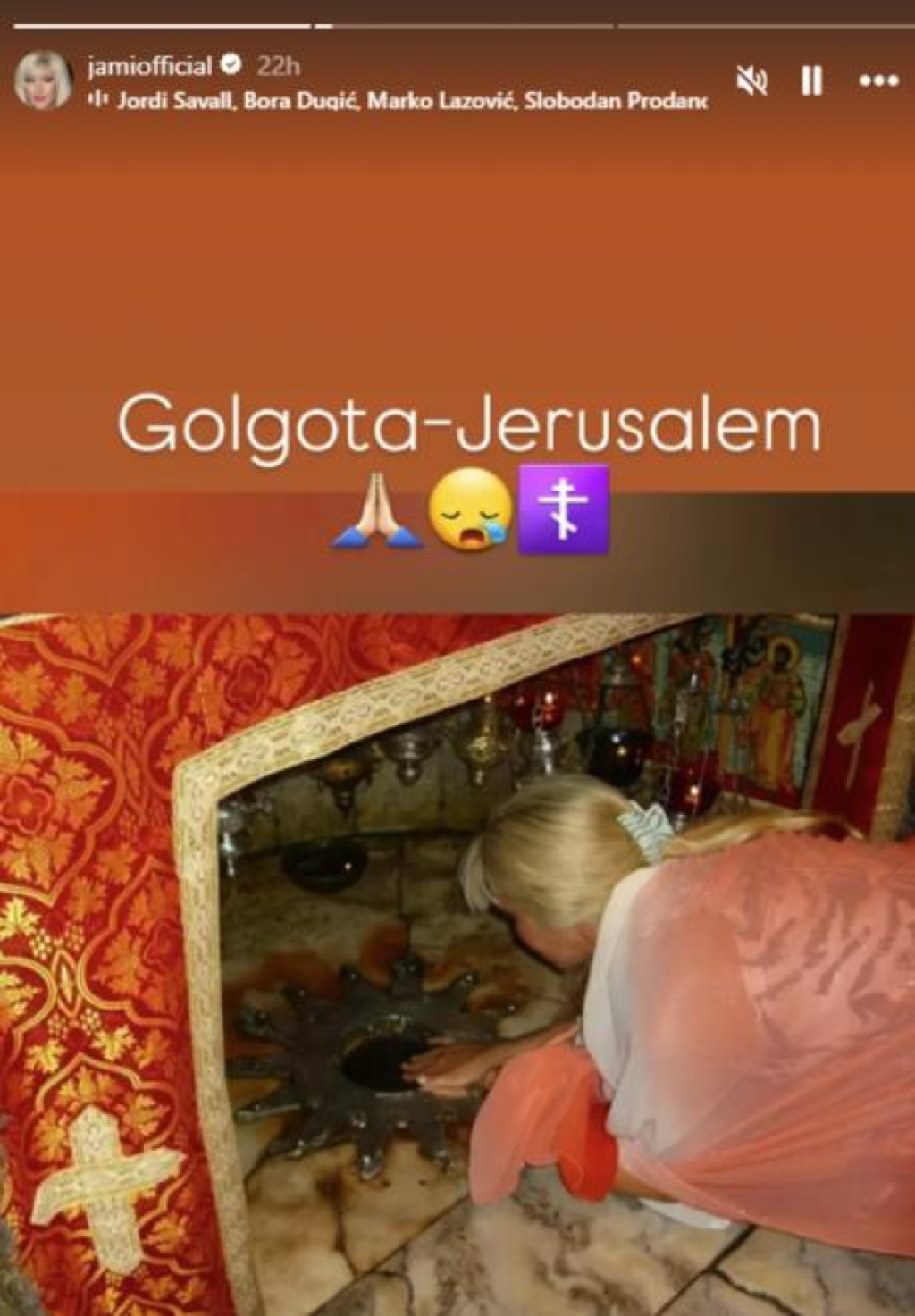 - Kamen-ploča Miropomazanja, Jerusalim, na kojoj je bilo spušteno Hristovo telo nakon raspeća - napisala je Jami u svojoj objavi, na kojoj se vidi kako se poklonila svetoj kamen-ploči.